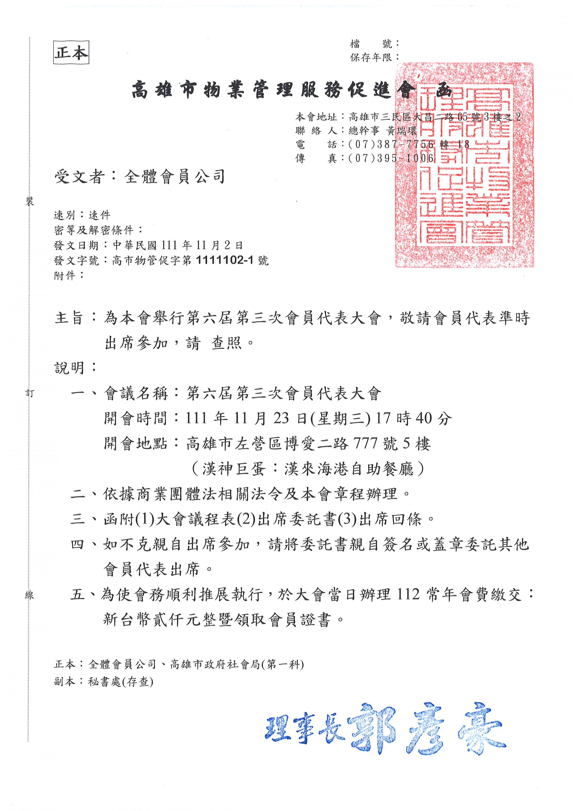 為本會舉行第六屆第三次會員代表大會,敬請會員代表準時出席參加