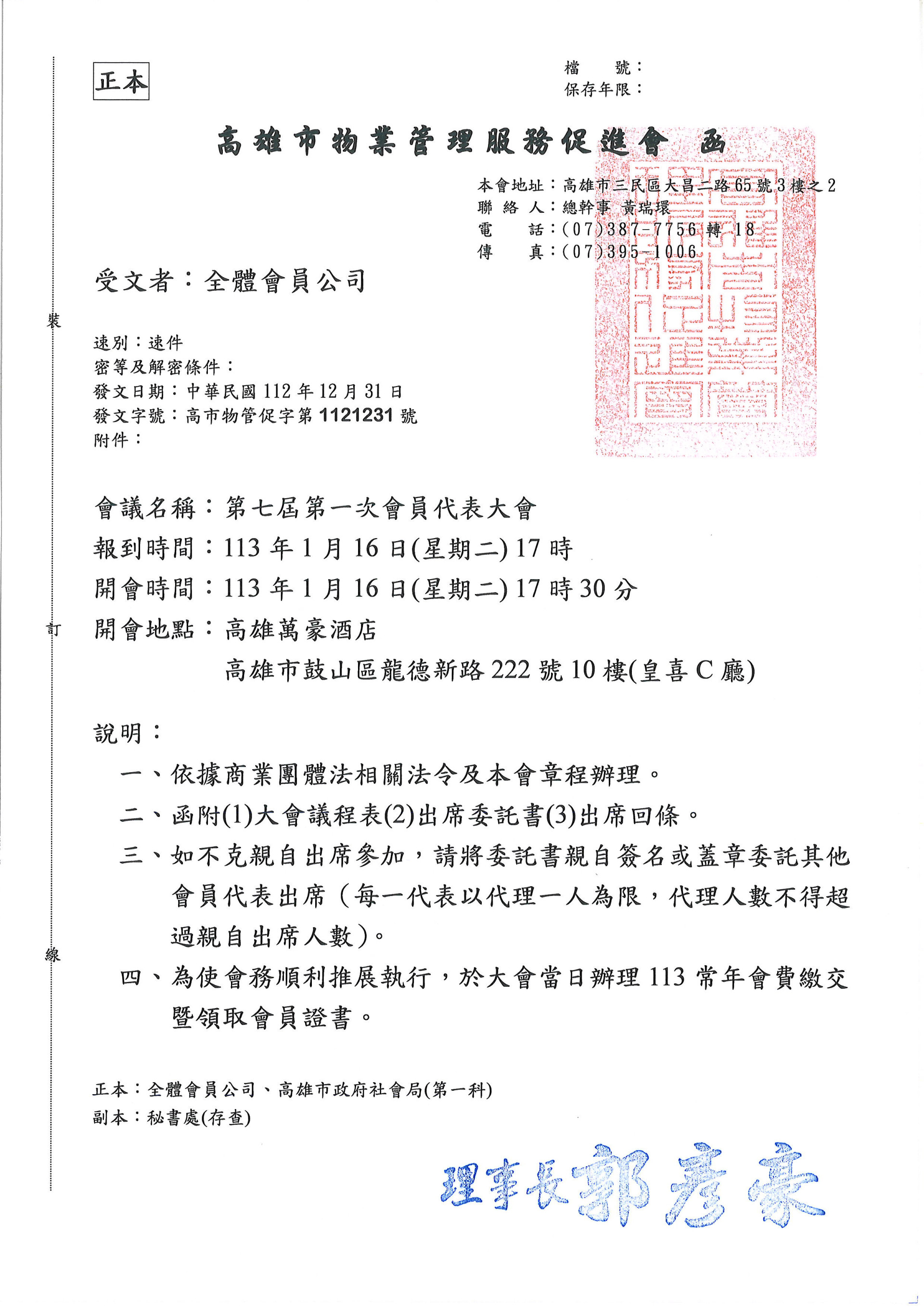 本會舉行第七屆第一次會員代表大會,敬請會員代表準時出席參加