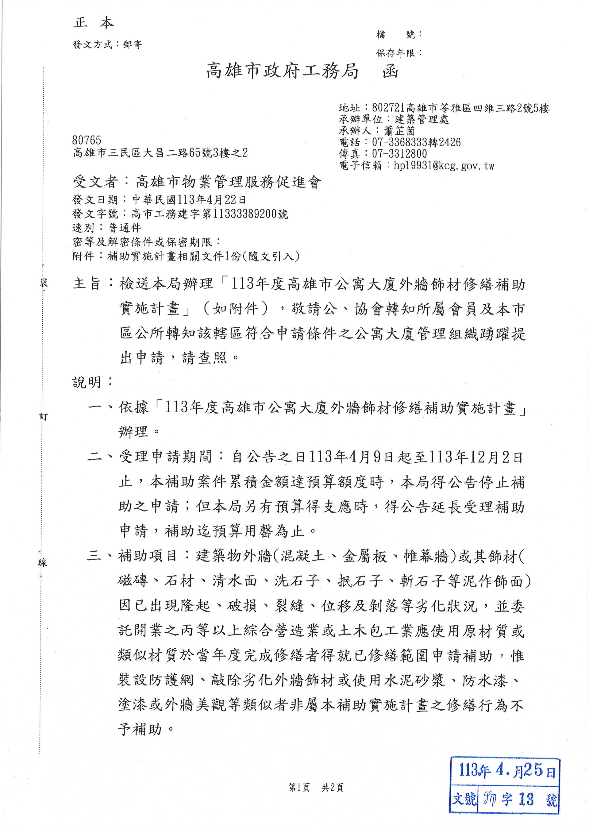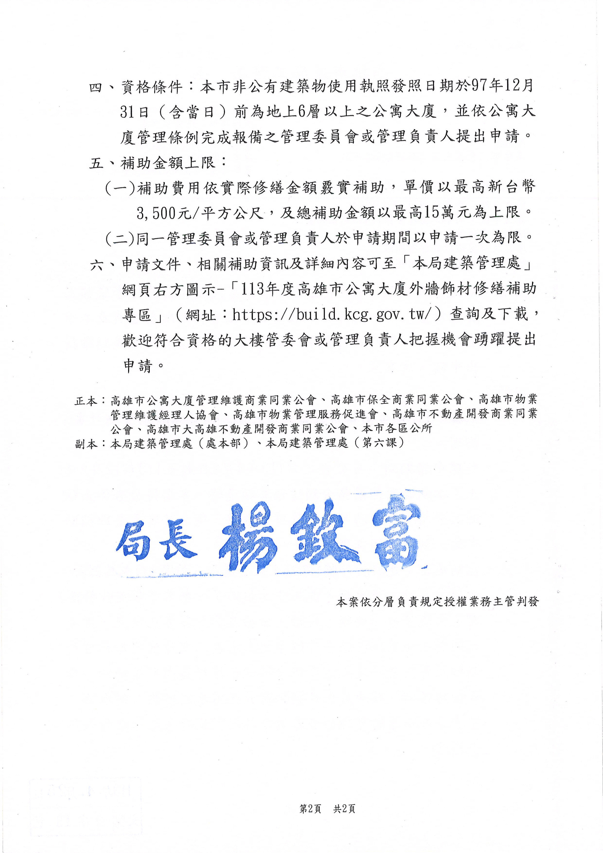 本局辦理[113年度高雄市公寓大廈外牆飾材修繕補助實施計畫]