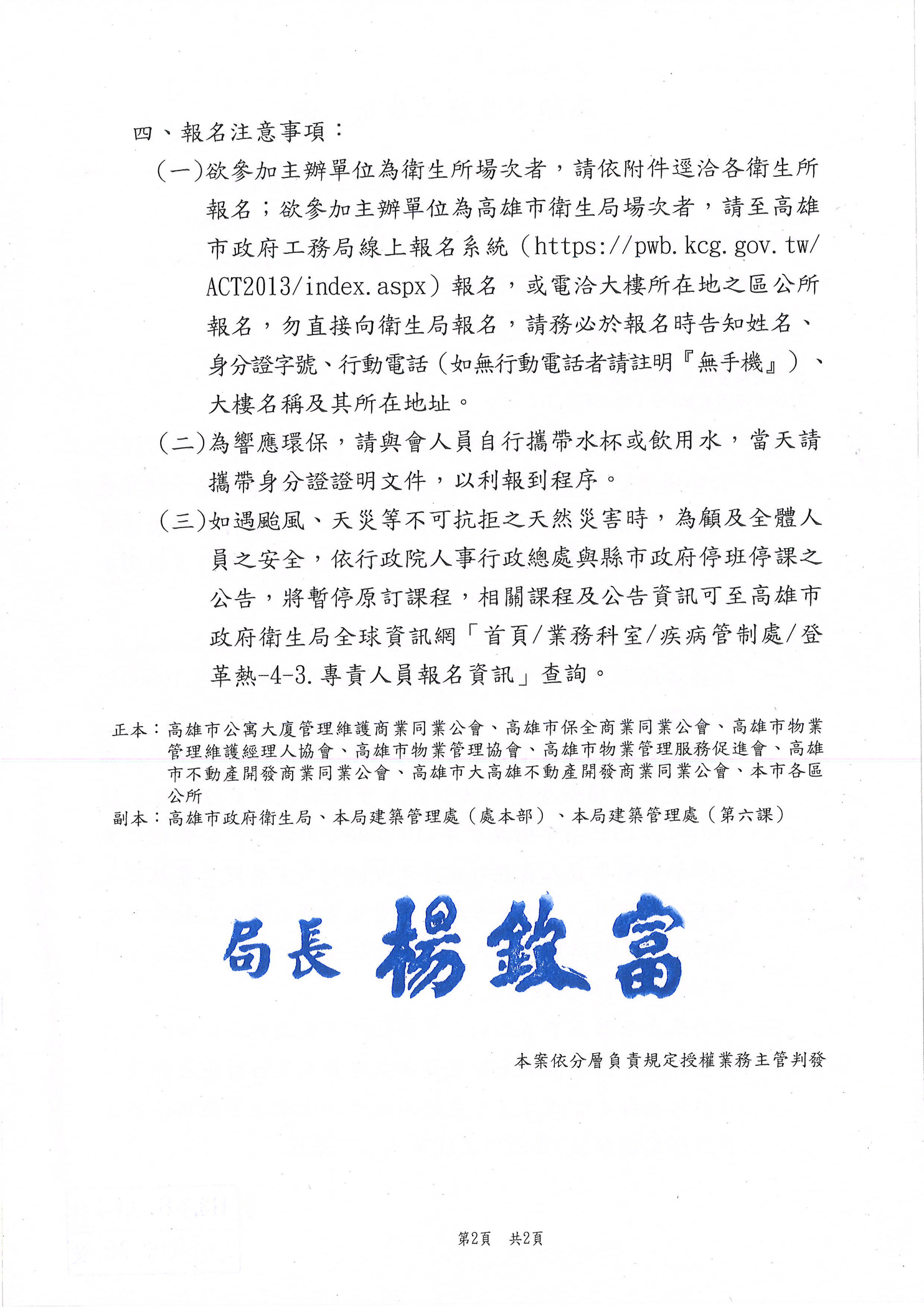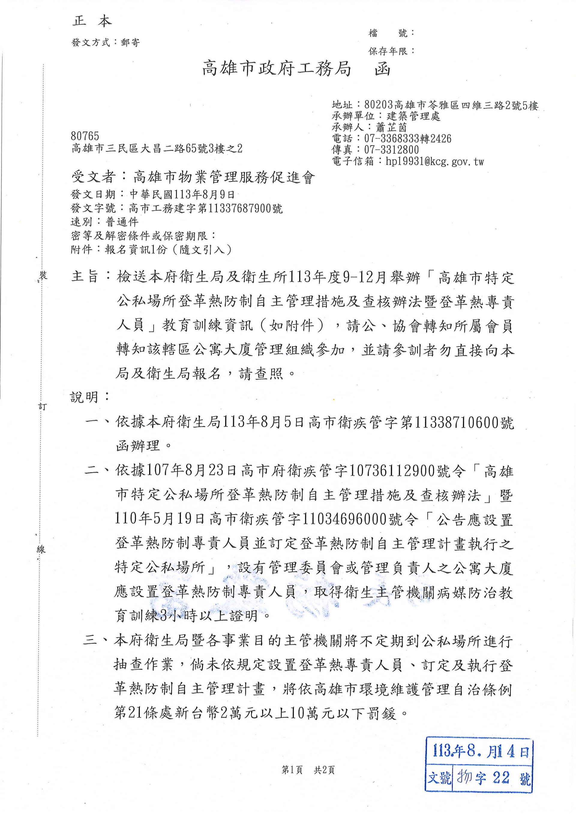 檢送本府衛生局113年度9-12月舉辦[高雄市特定公私場所登革熱防制自主管理措施及查核辦法暨登革熱專責人員]教訓訓練資訊