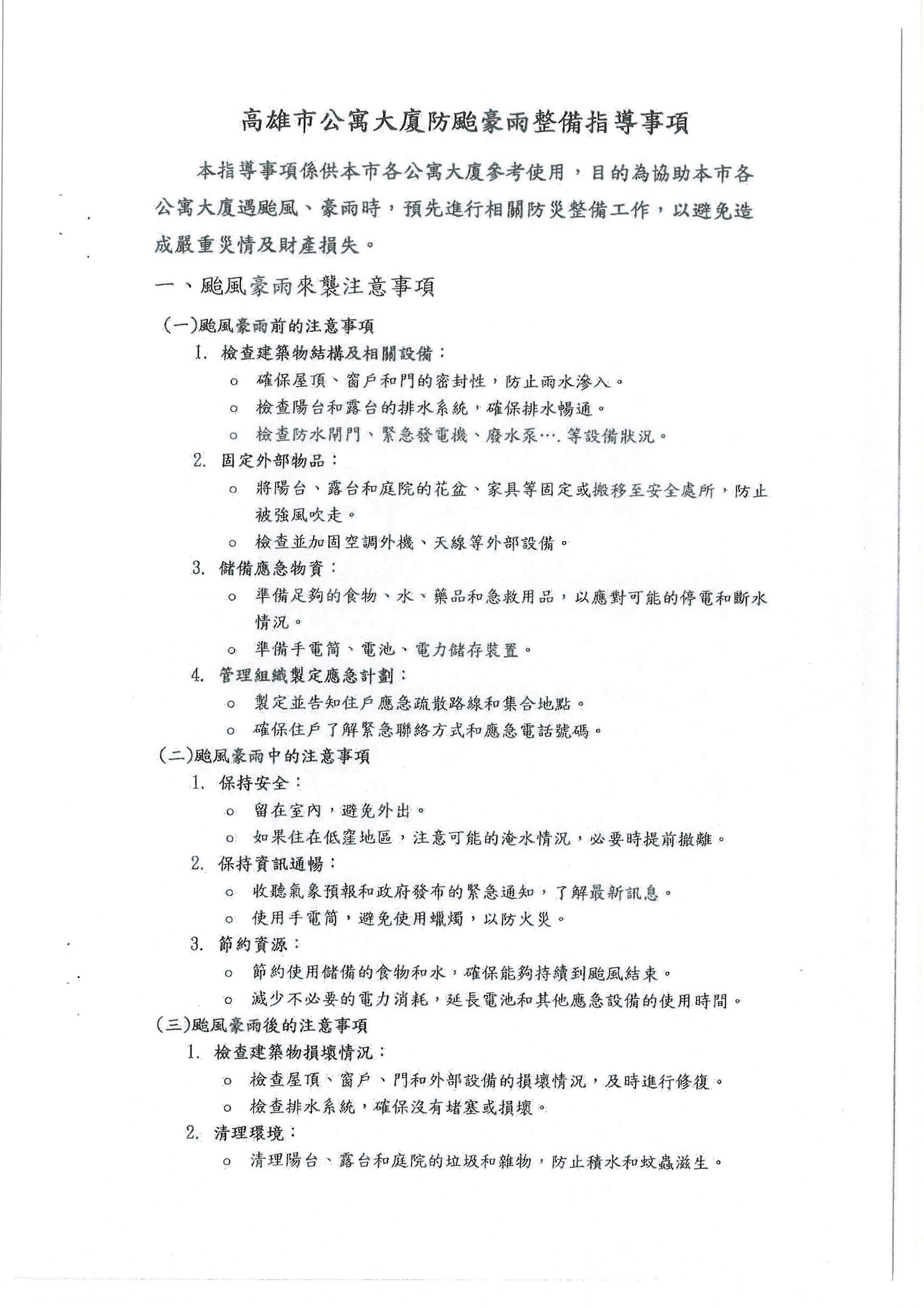 本局113年8月16日為研商訂定[高雄市公寓大廈防颱整備指導事項]