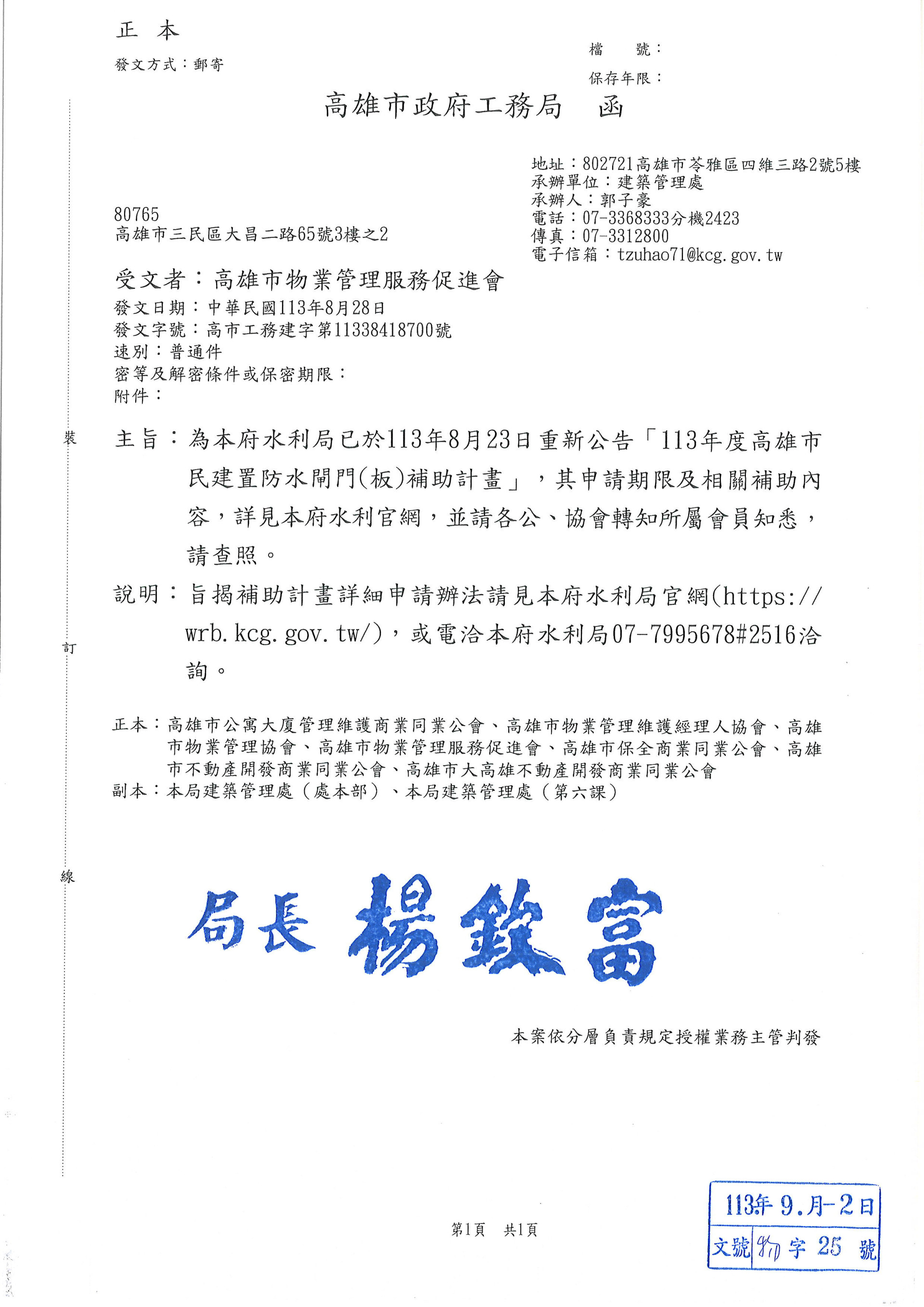 113年8月23日重新公告[113年度高雄市民建置防水閘門(板)補助計畫]