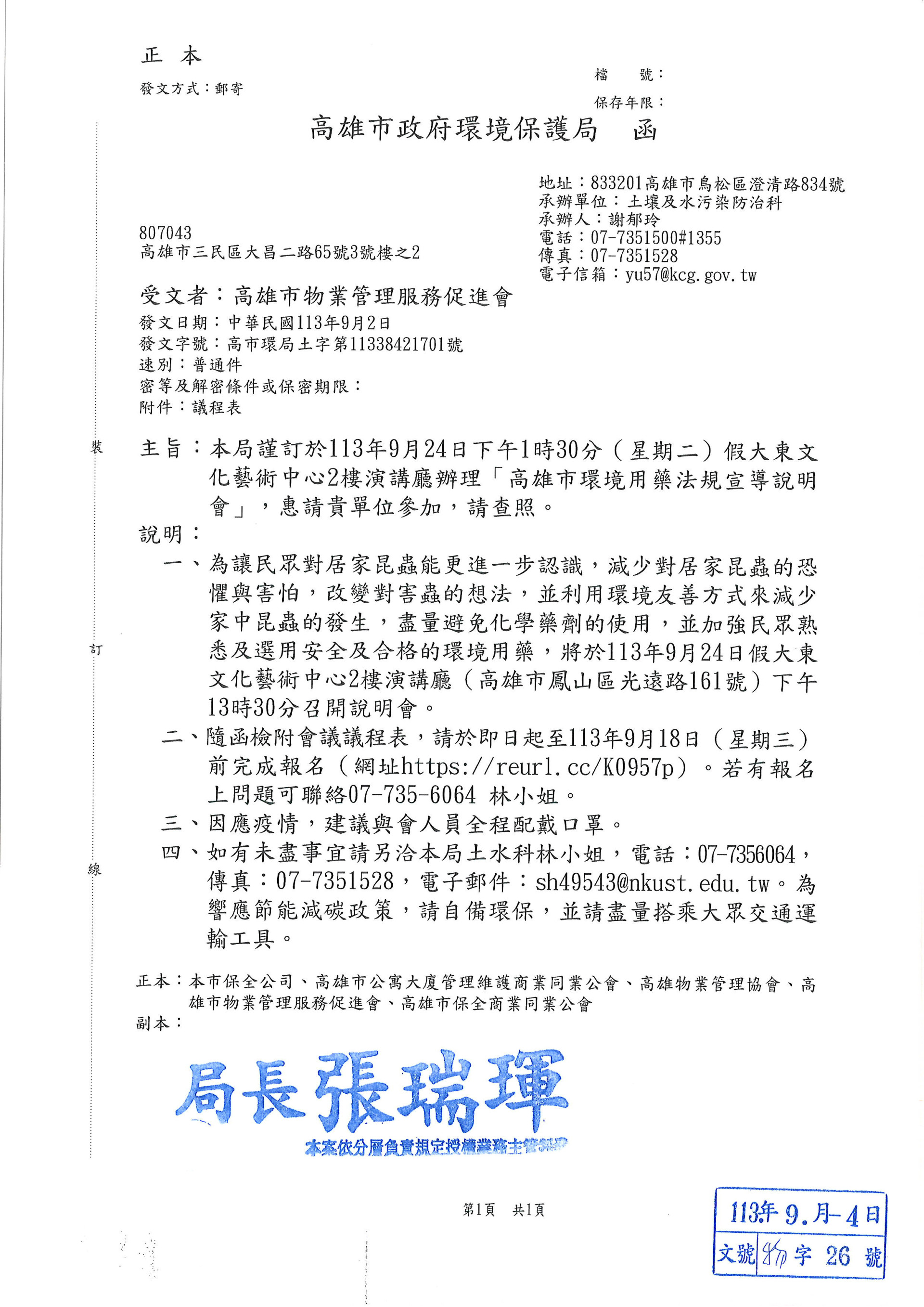 謹訂於113年9月24日下午1時30分(二)假大東文化藝術中心2樓演講廳辦理[高雄市環境用藥法規宣導說明會]
