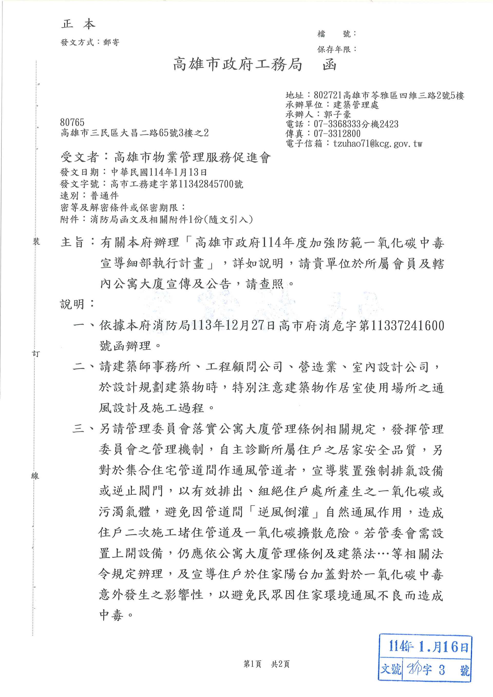 辦理[高雄市政府114年度加強防範一氧化碳中毒宣導細部執行計畫]