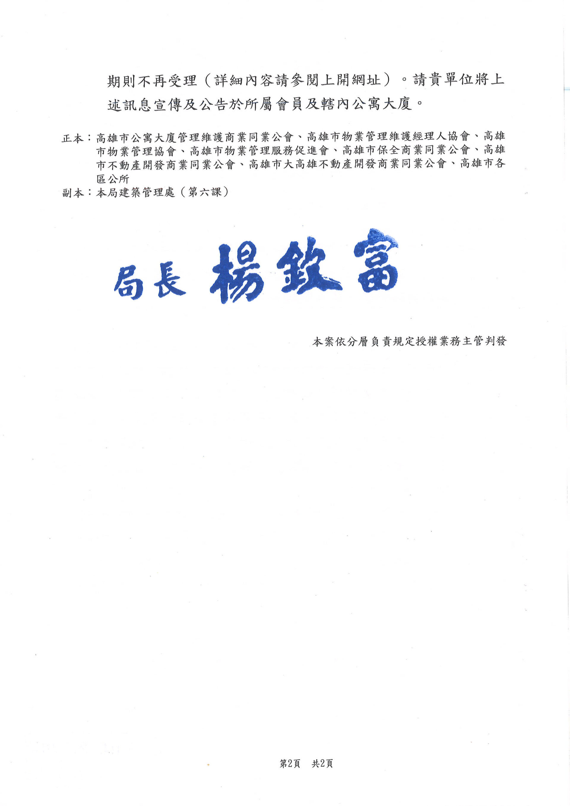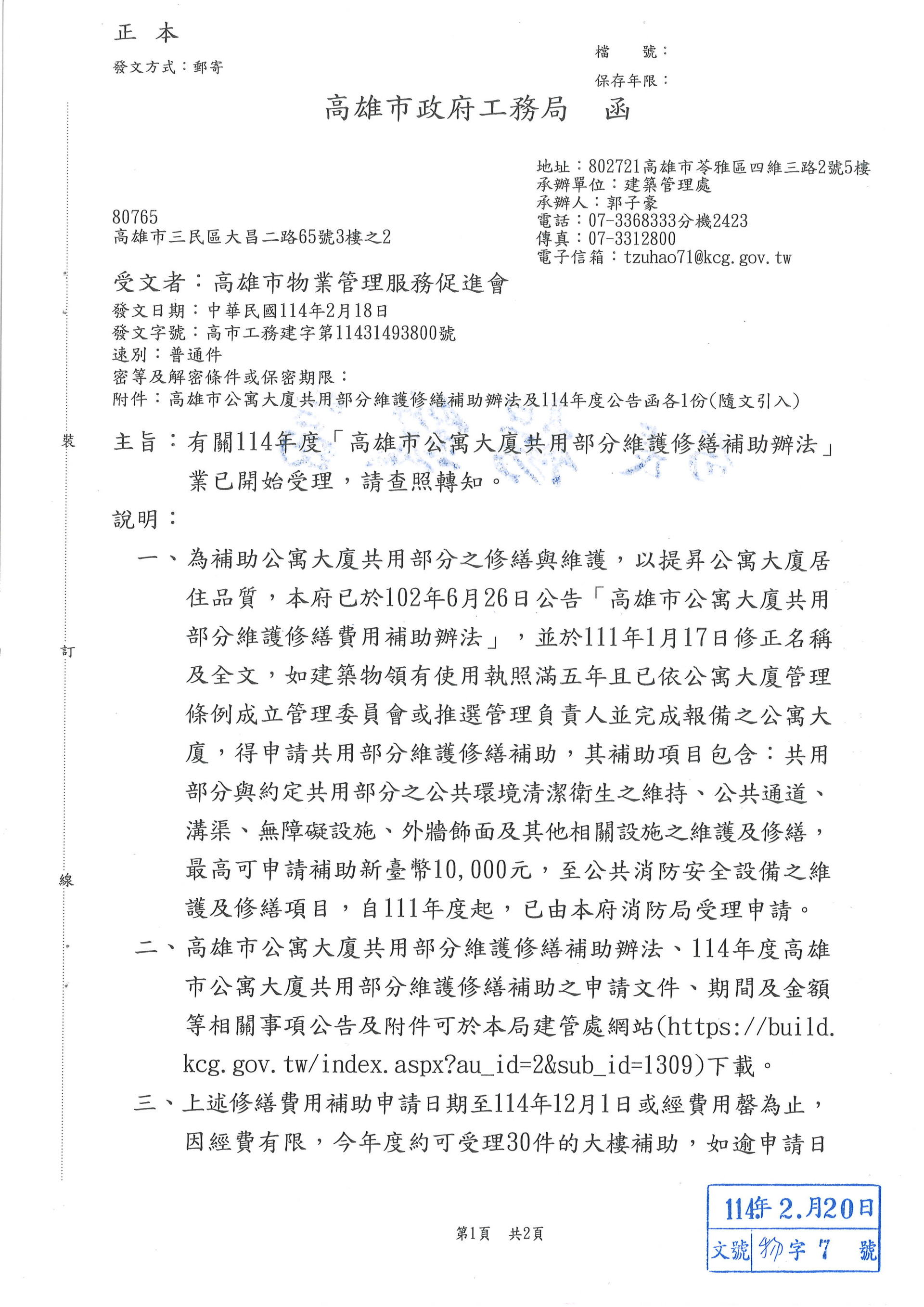 114年度[高雄市公寓大廈共用部分維護修繕補助辦法]業已開始受理