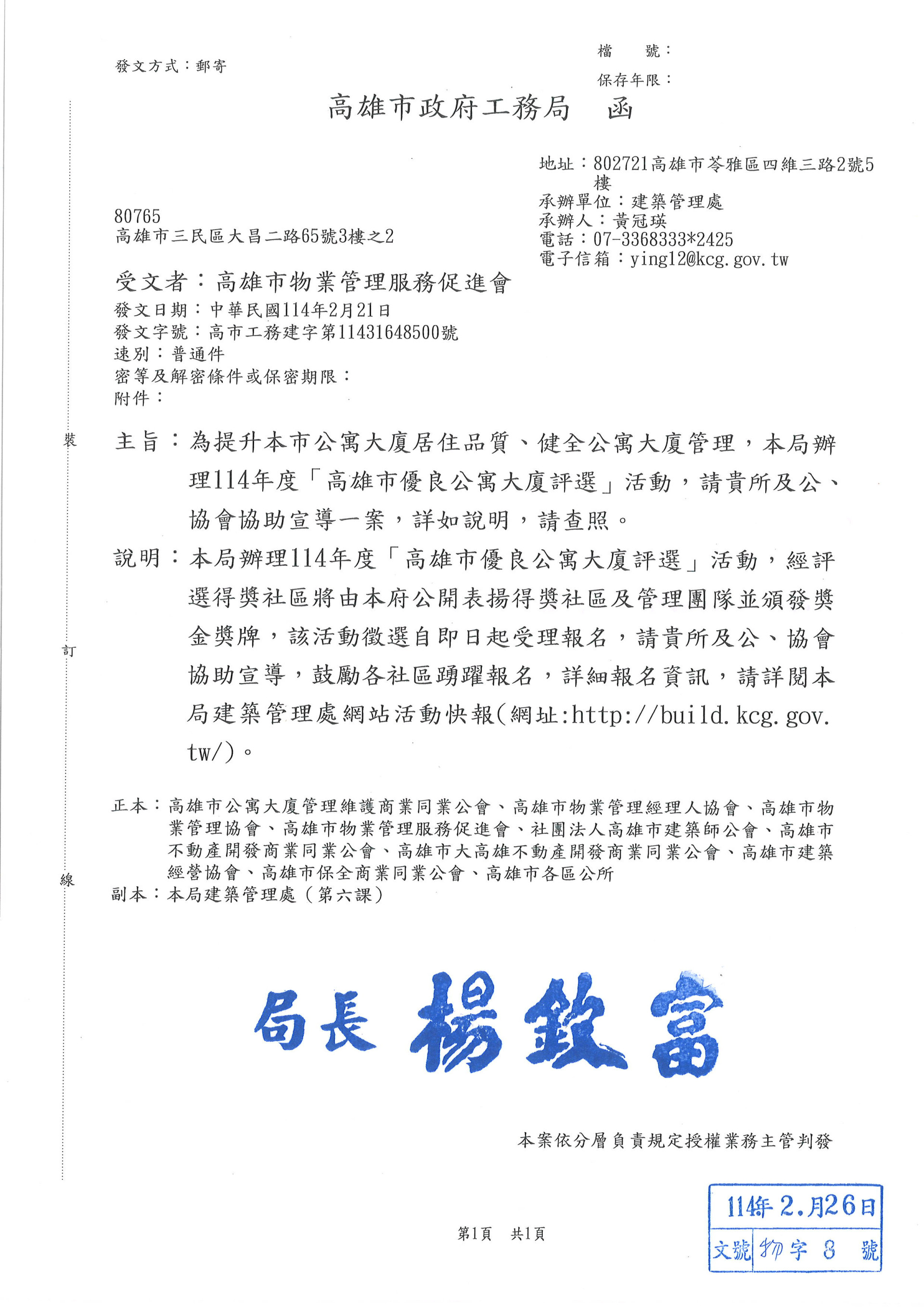 辦理114年度[高雄市優良公寓大廈評選]活動