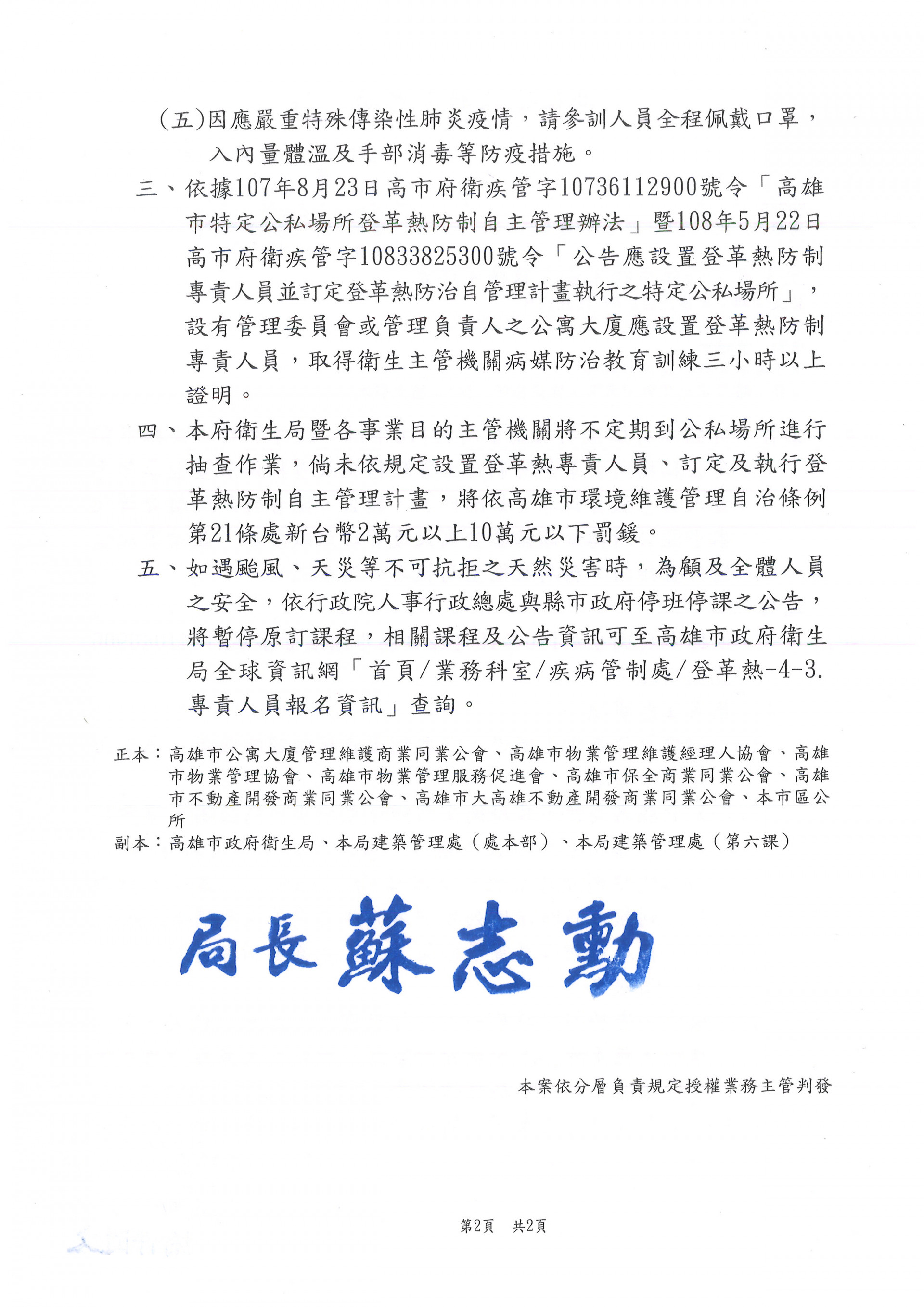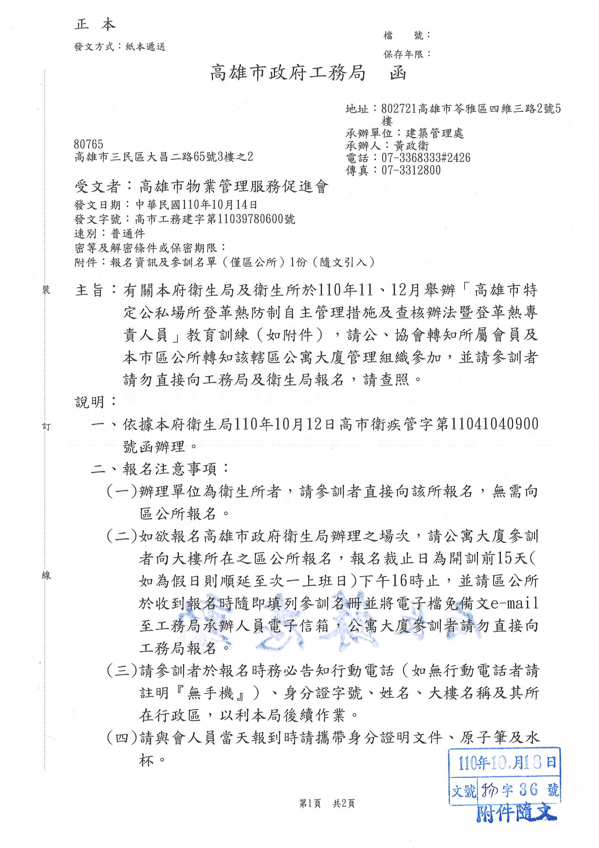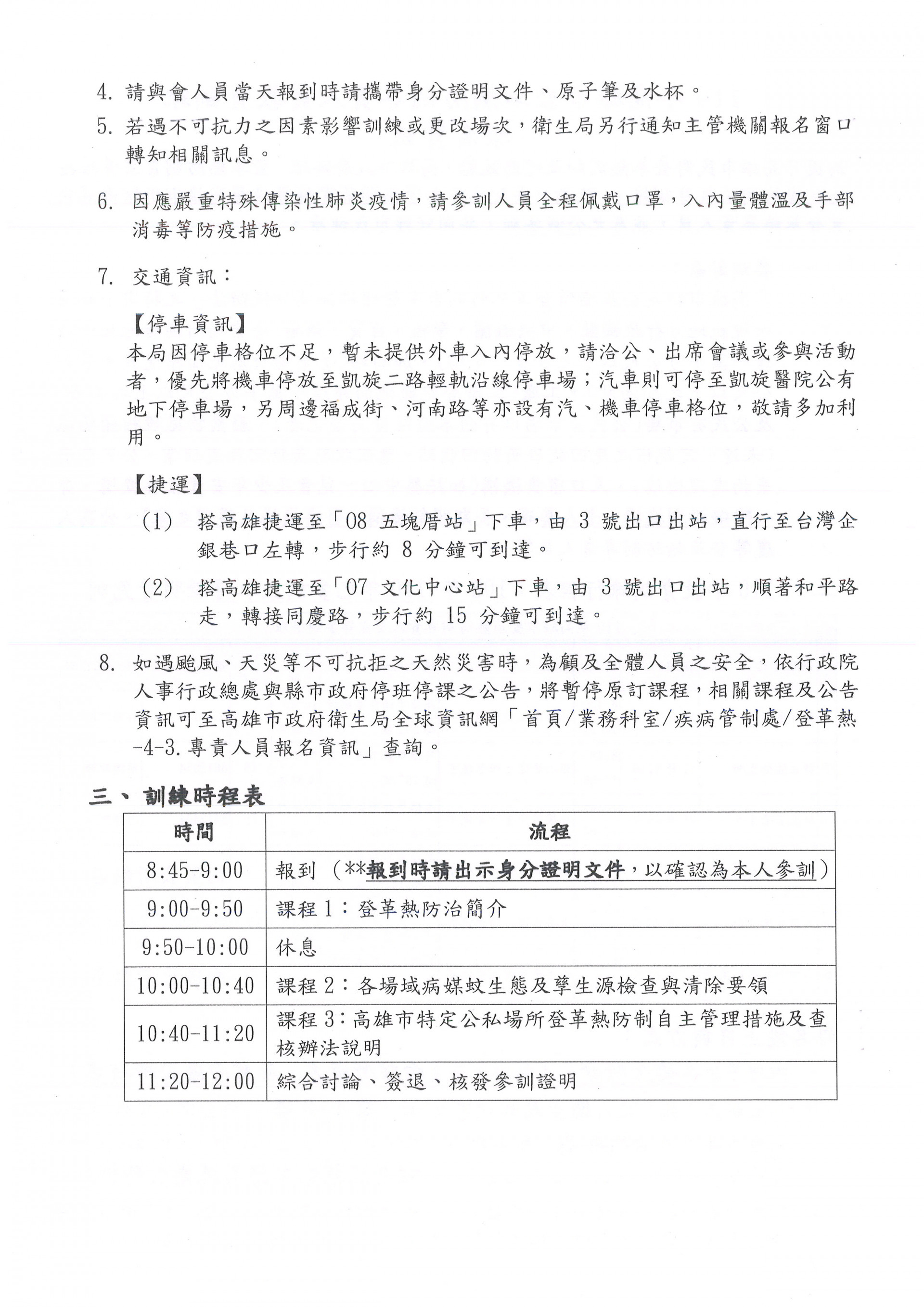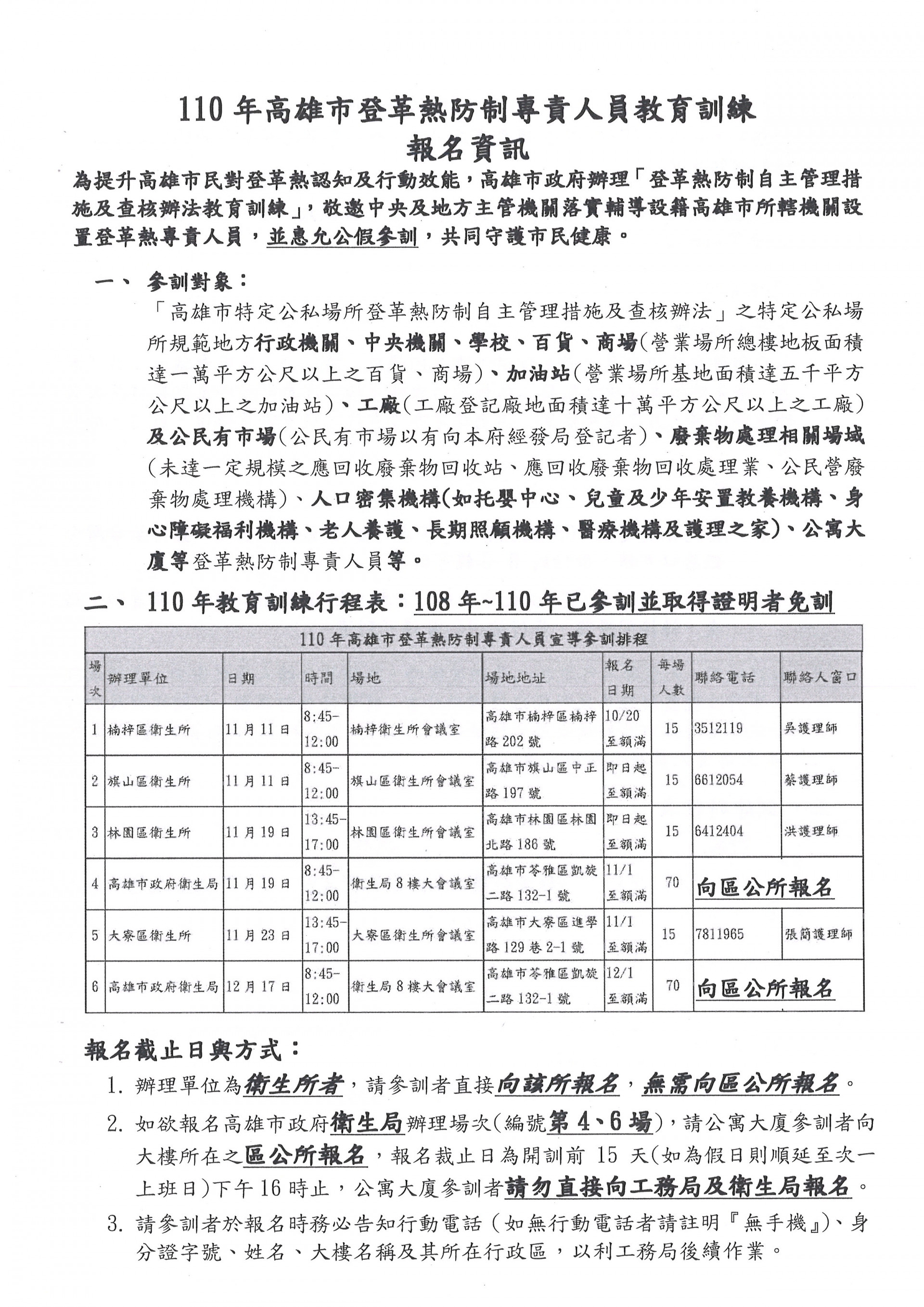 有關本府衛生局(所)於110年11、12月舉辦[高雄市特定公私場所登革熱防制自主管理措施及查核辦法暨登革熱專責人員]訓練