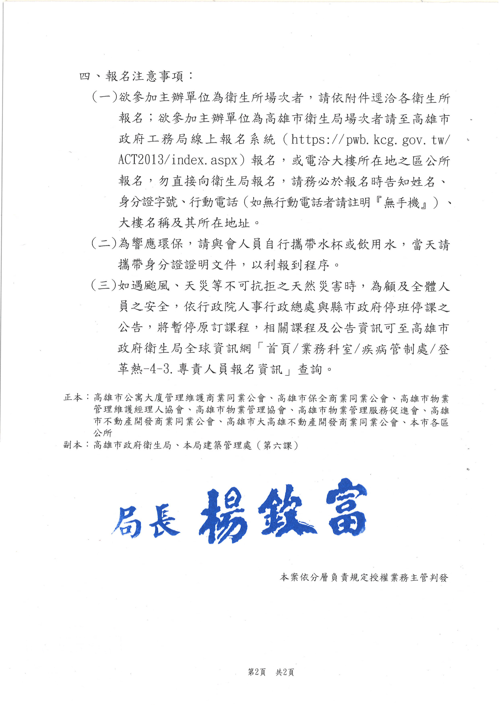檢送本府衛生局(所)114年度6月-12月舉辦[高雄市特定公私場所登革熱防制自主管理措施及查核辦法暨登革熱專責人員]教育訓練
