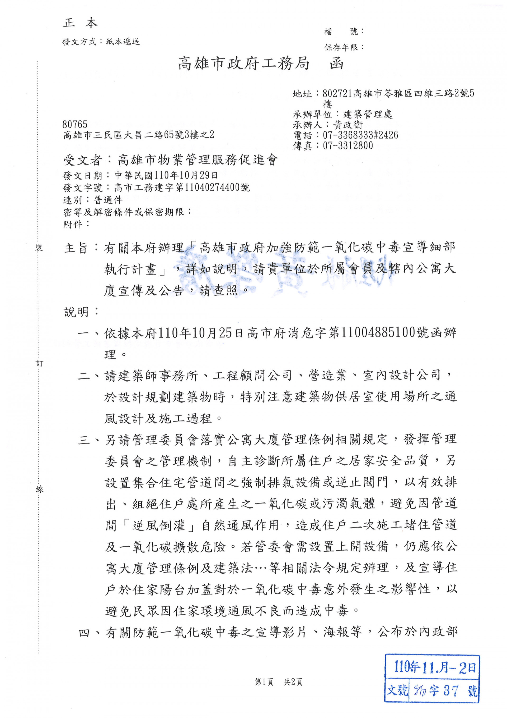 有關本府辦理[高雄市政府加強防範一氧化碳中毒宣導細部執行計畫]