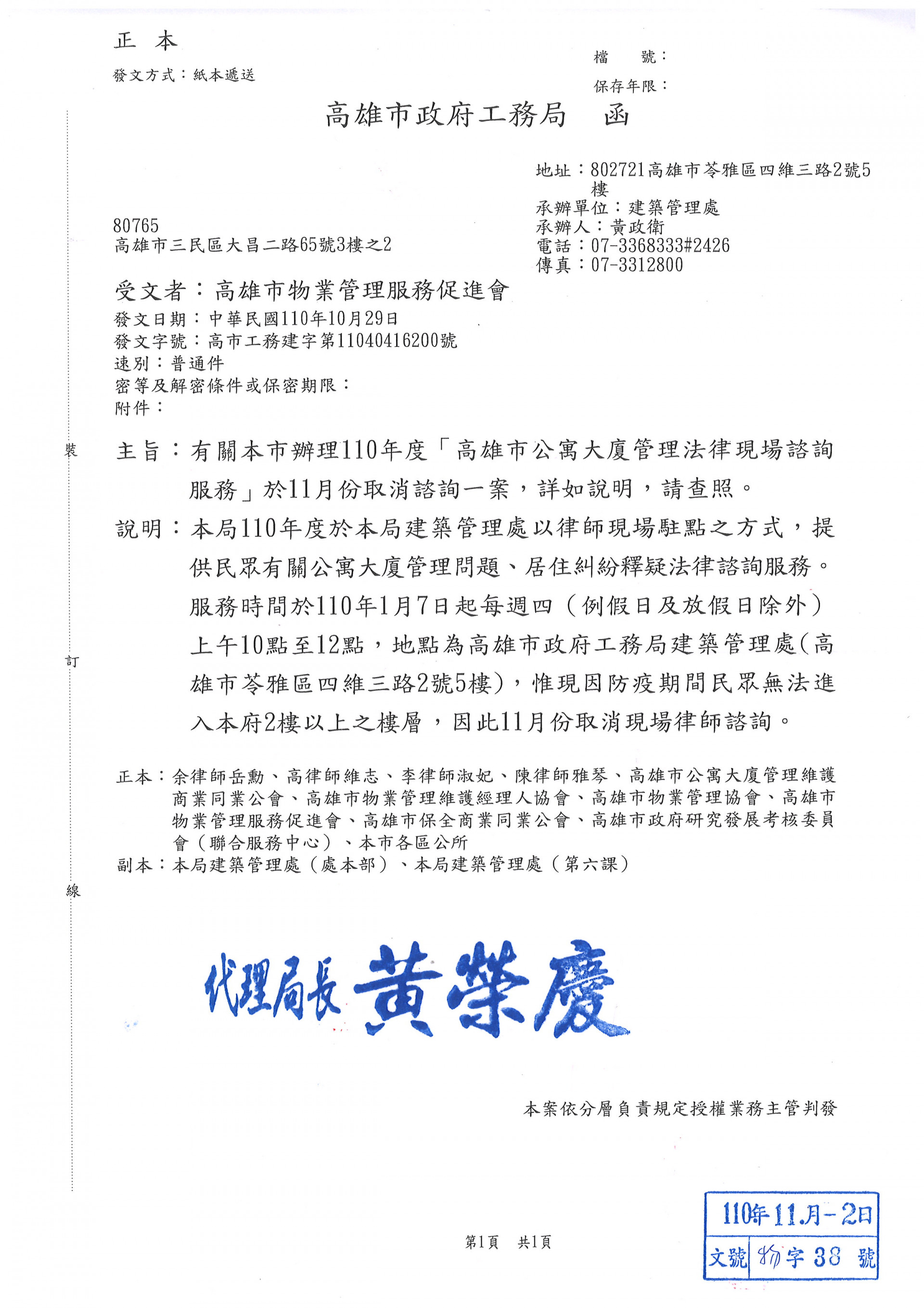 110年度[高雄市公寓大廈管理法律現場諮詢服務]於11月份取消諮詢一案