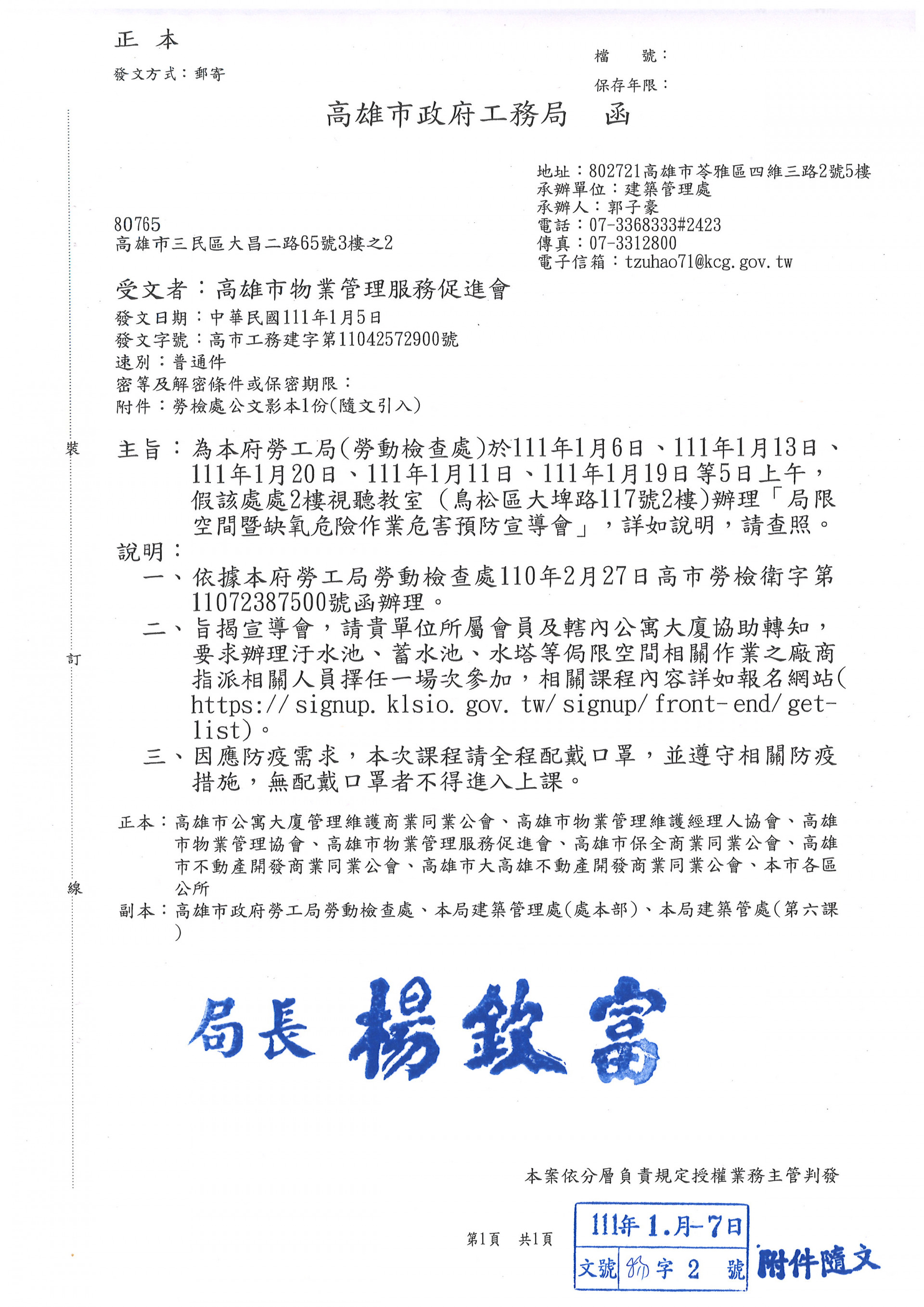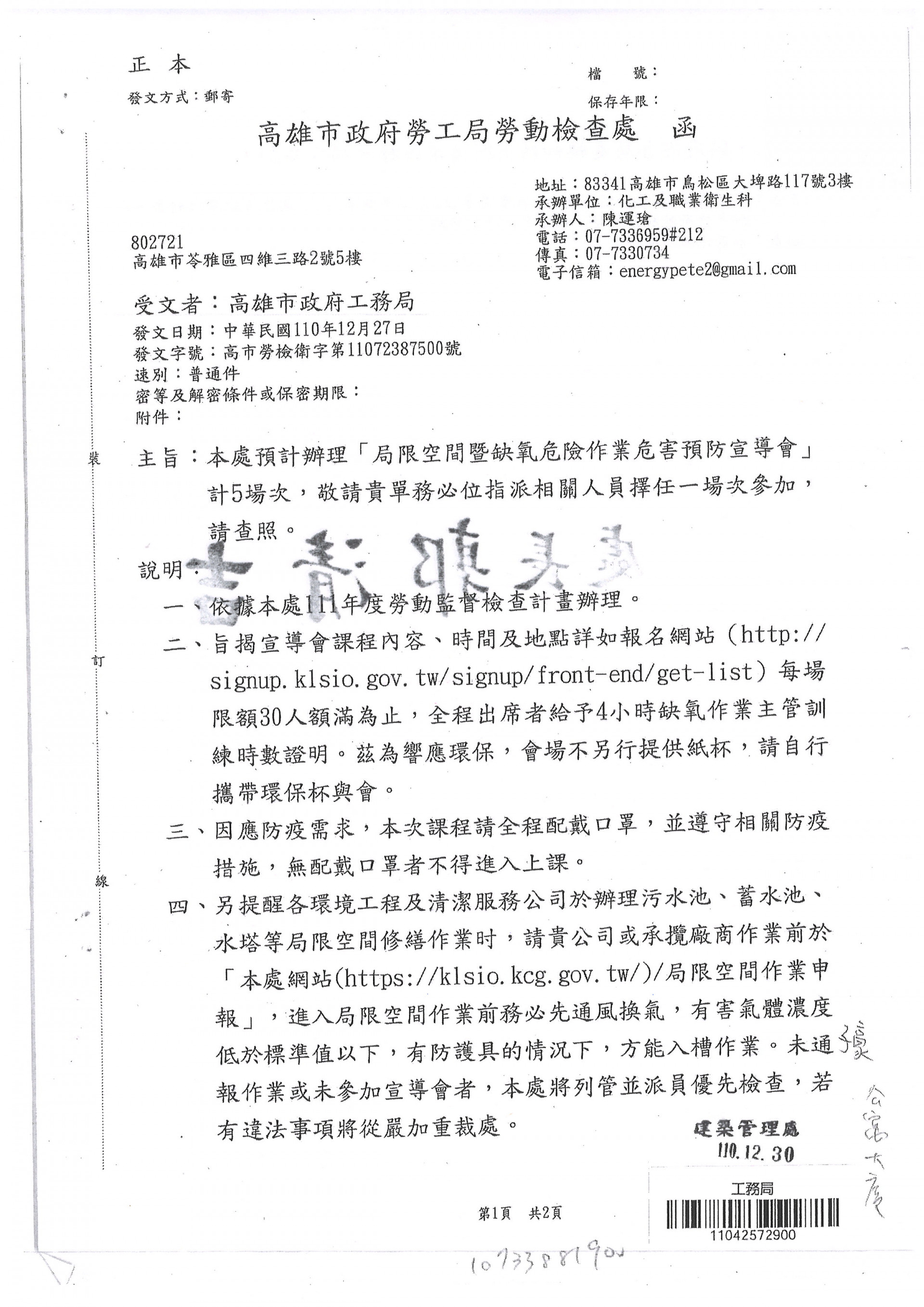 勞工局(勞動檢查處)於111/1/6、1/13、1/20、1/111/19等五日上午假該處2樓視聽教室辦理[局限空間暨缺氧危險作業危害預防宣導會]