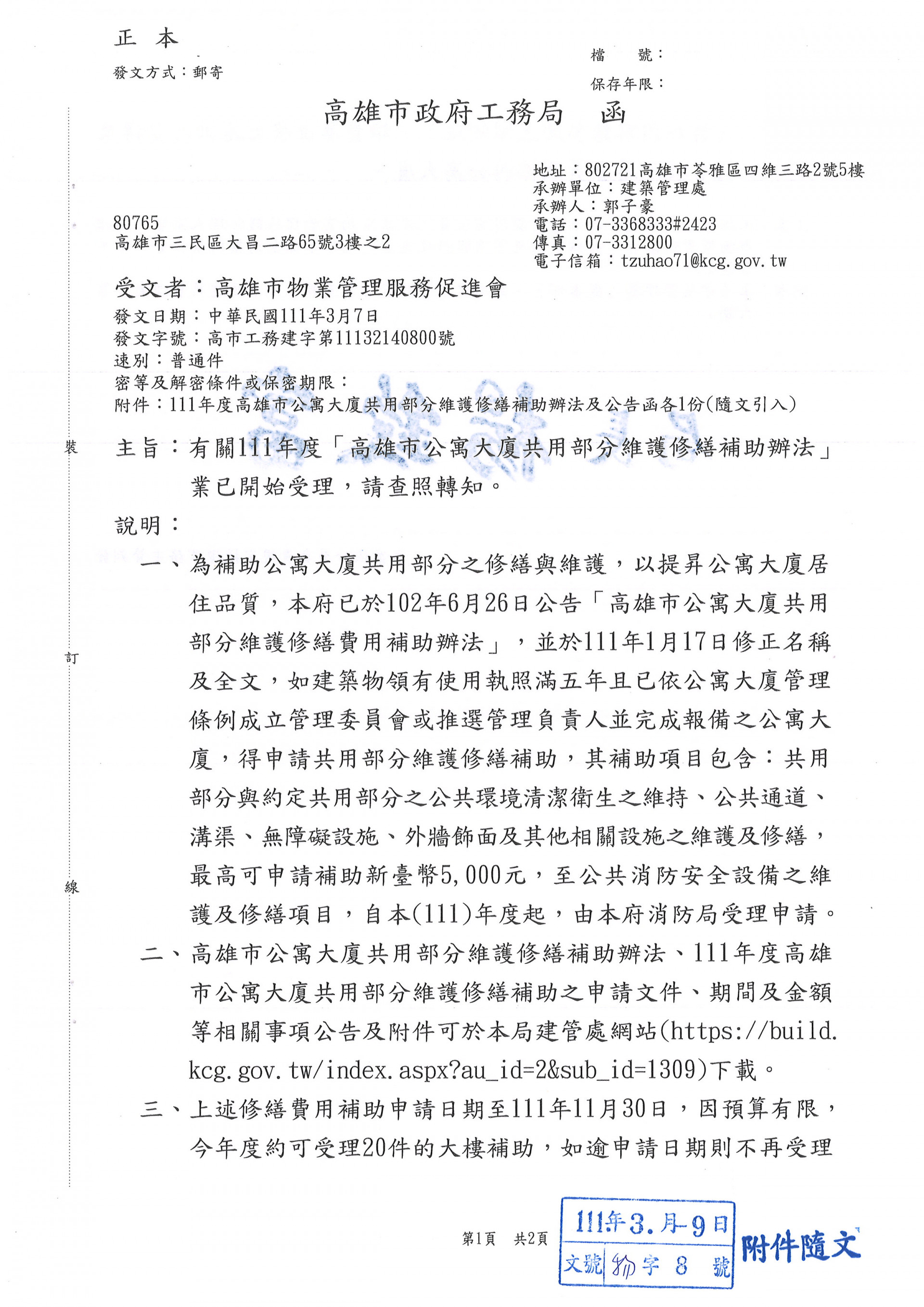 有關111年度[高雄市公寓大廈共用部分維護修繕補助辦法]業已開始受理
