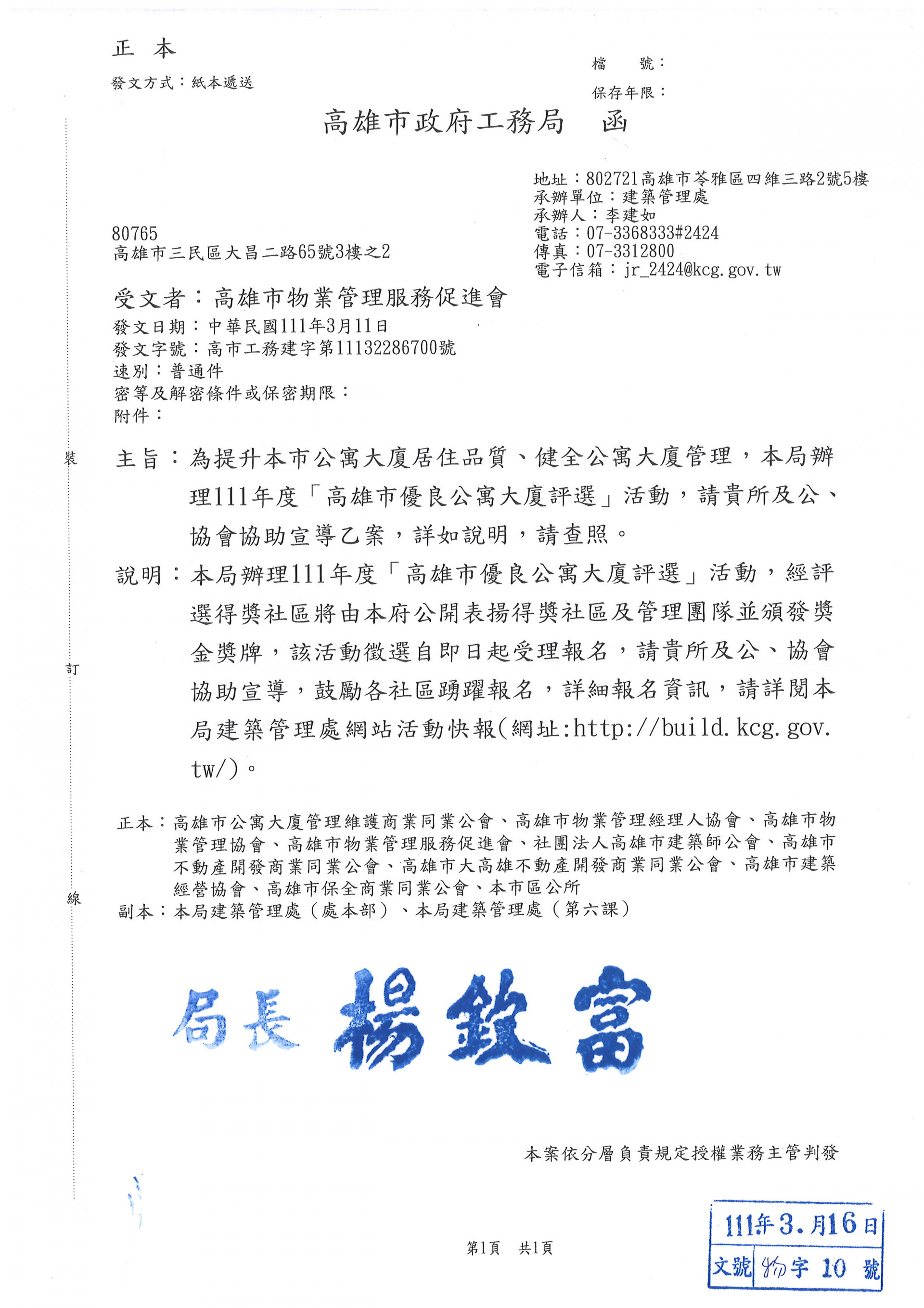 辦理111年度[高雄市優良公寓大廈評選]活動