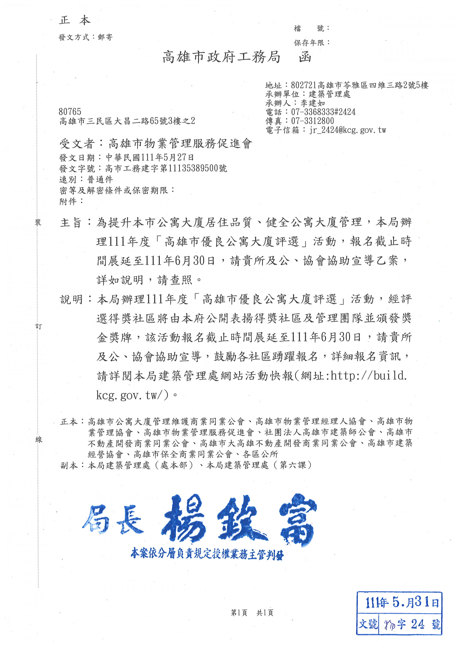 本局辦理111年度[高雄市優良公寓大廈評選]活動.報名截止時間展延至111月6月30日