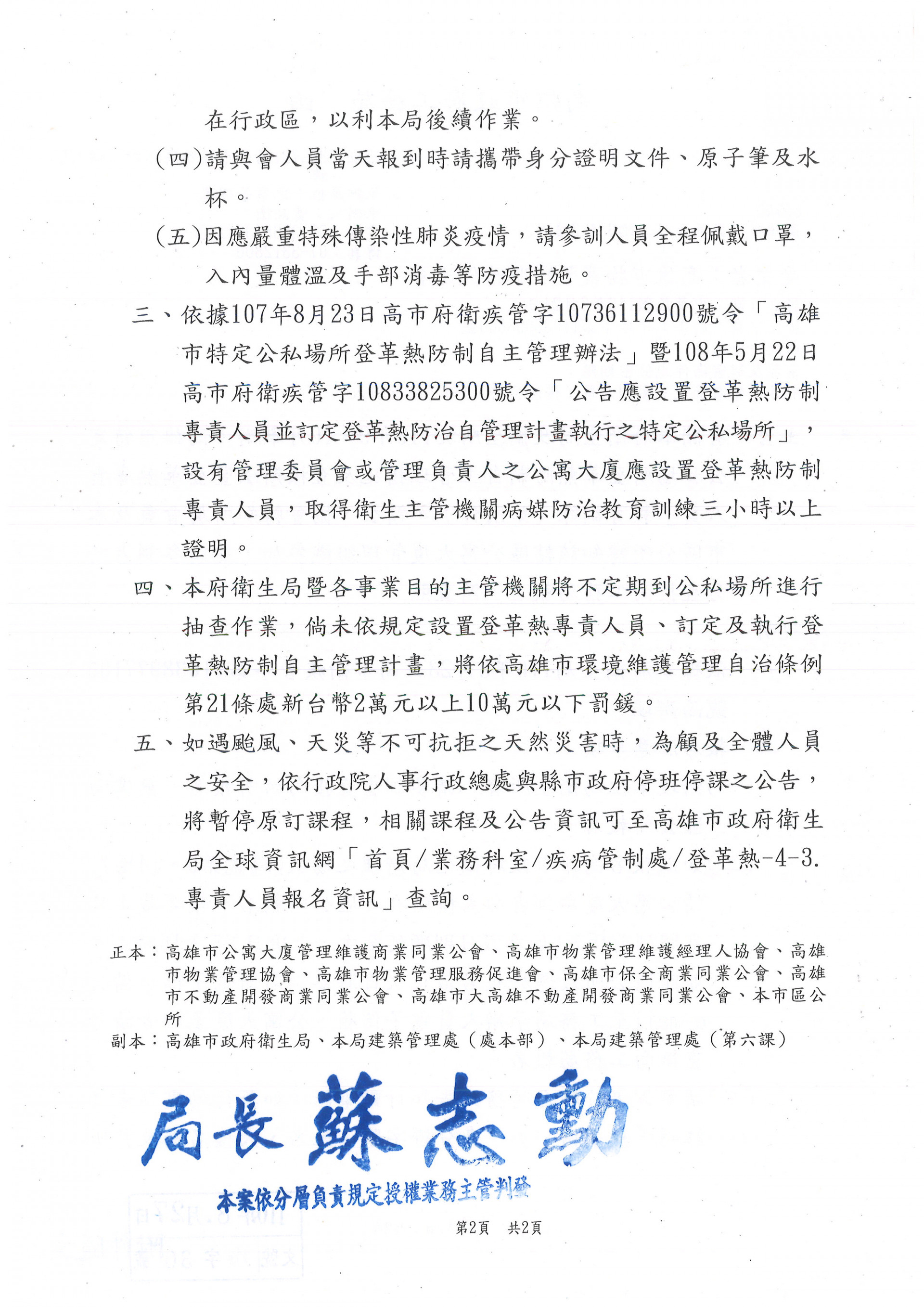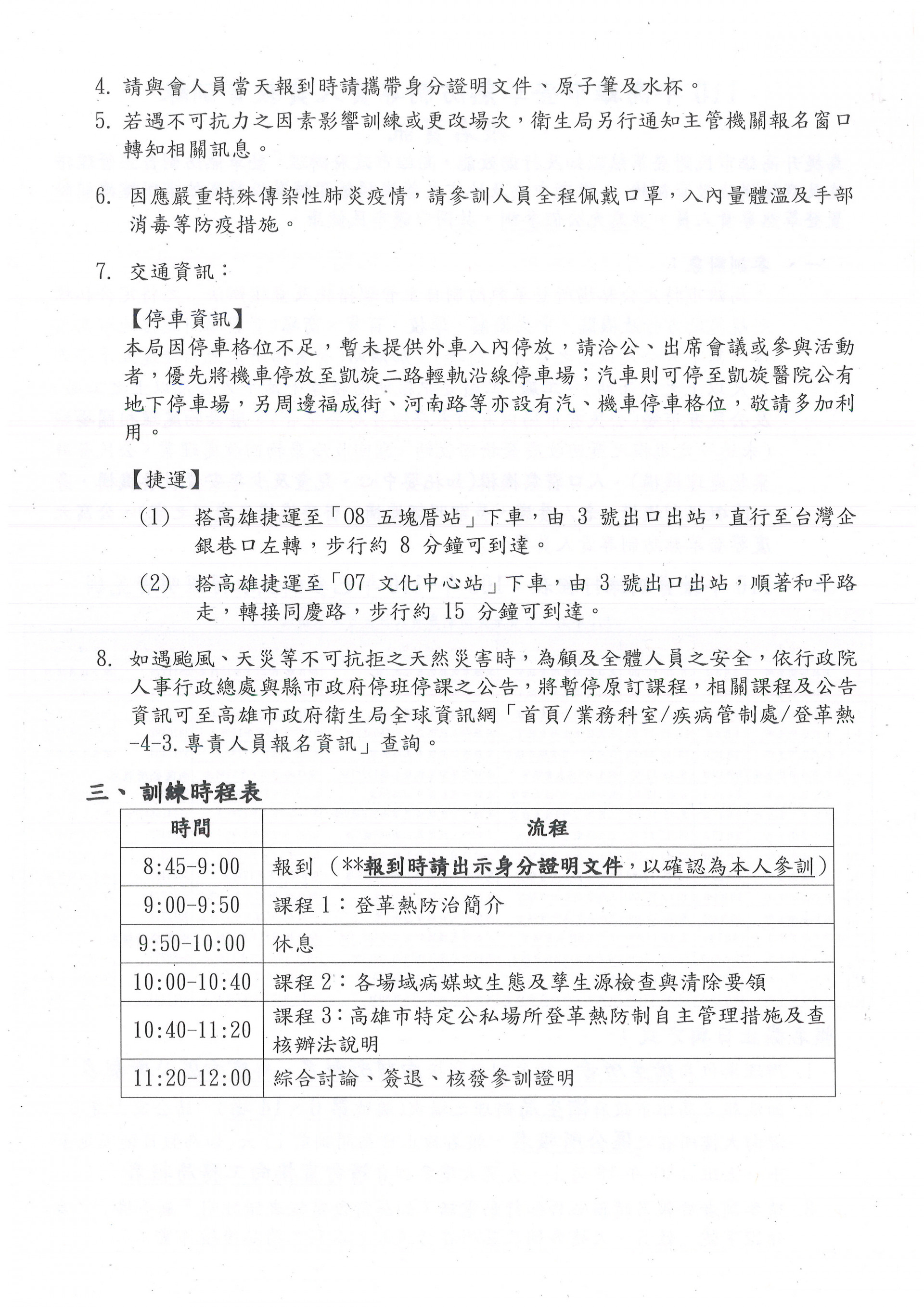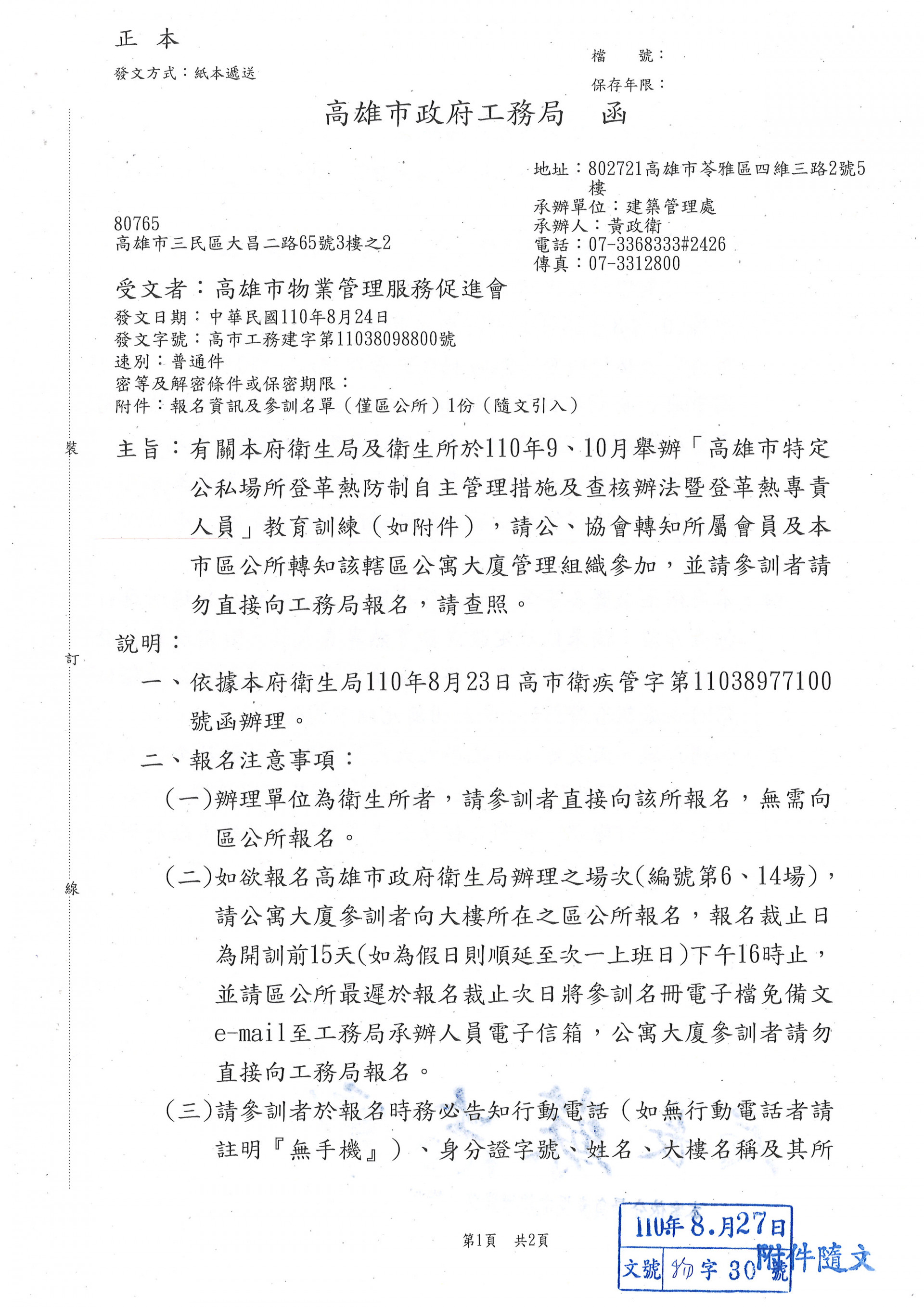 有關本府衛生局及衛生所於110年9、10月舉辦[高雄市特定公私場所登革熱防制自主管理措施及查核辦法暨登革熱專責人員]教育訓練(如附件)