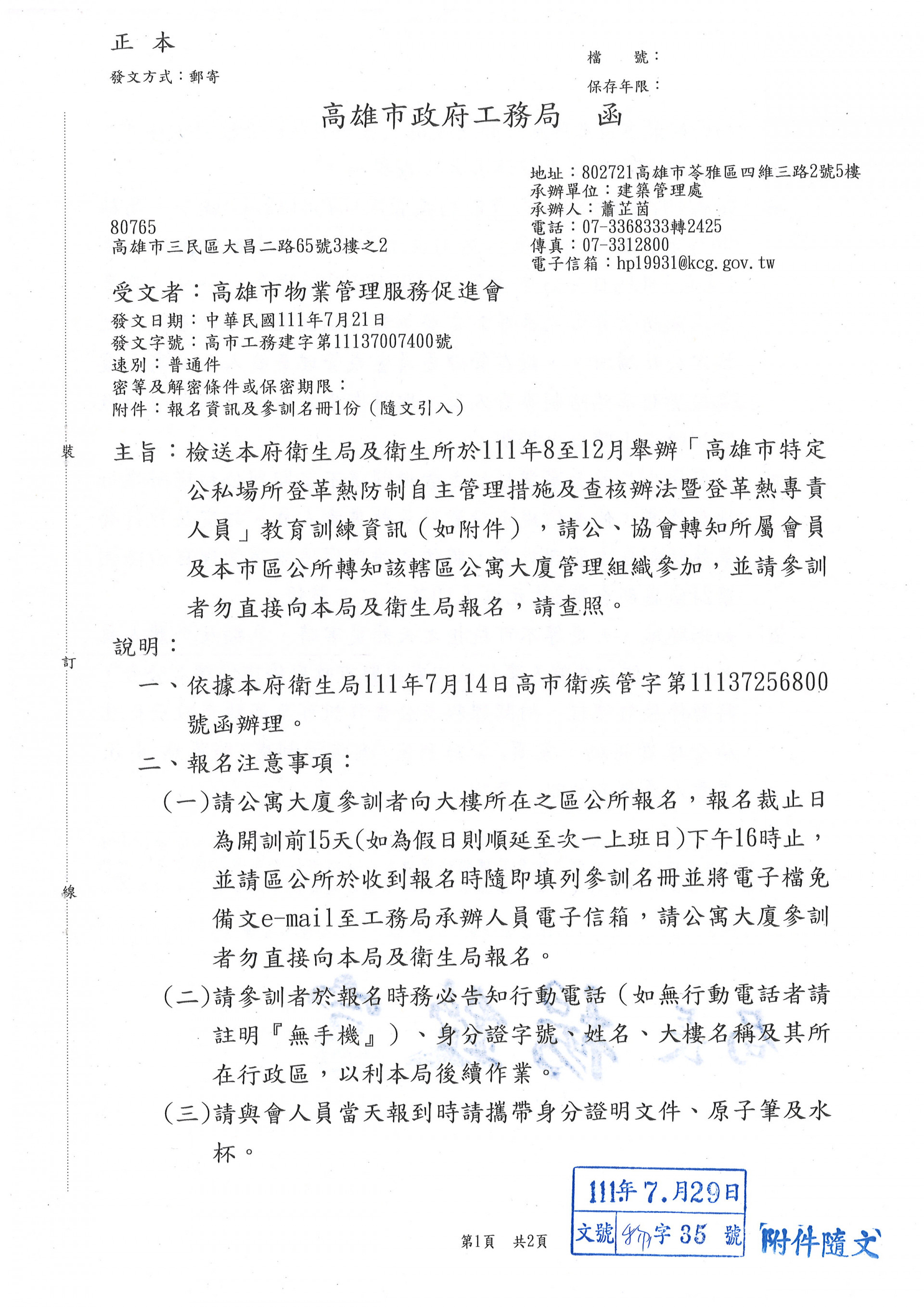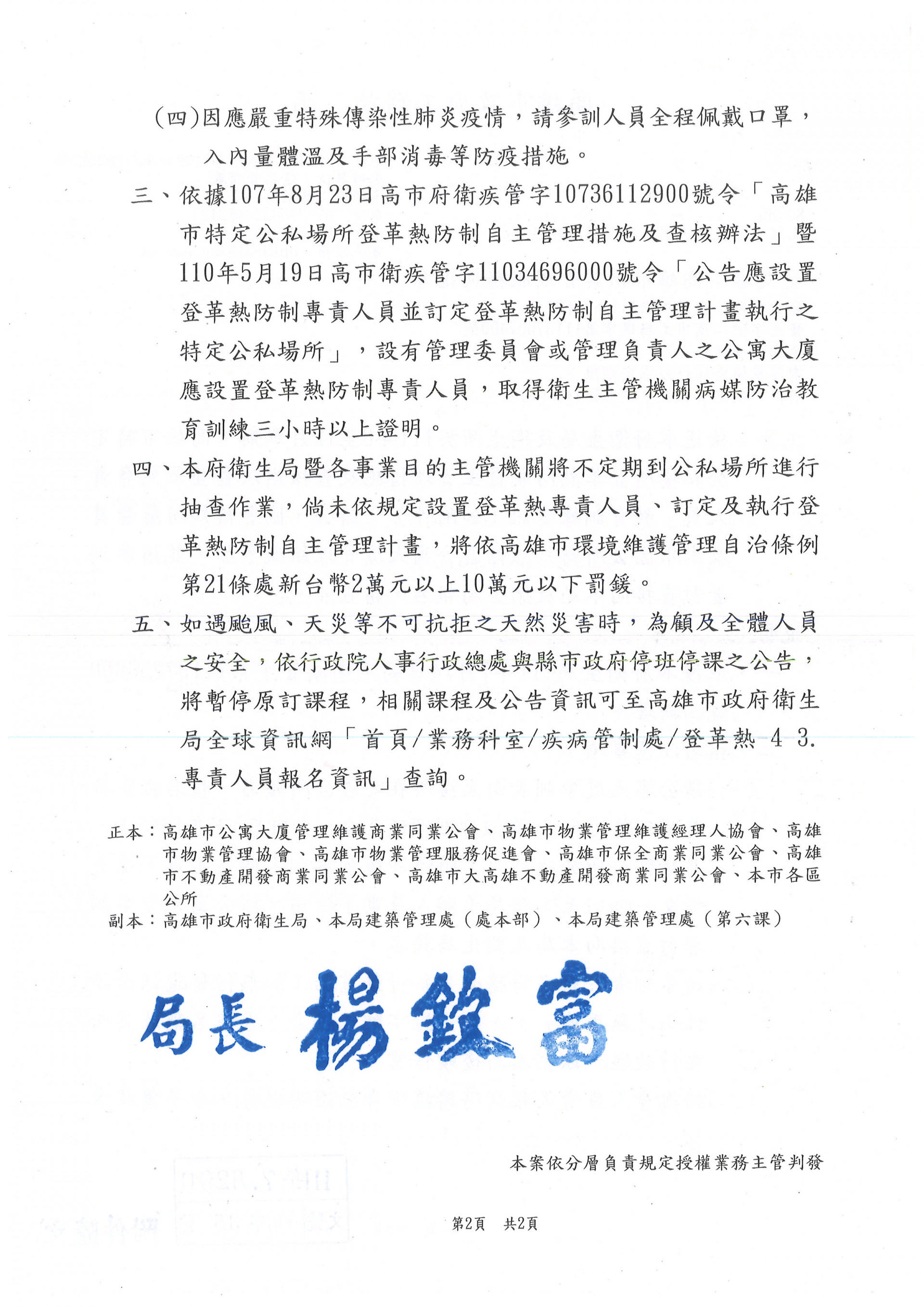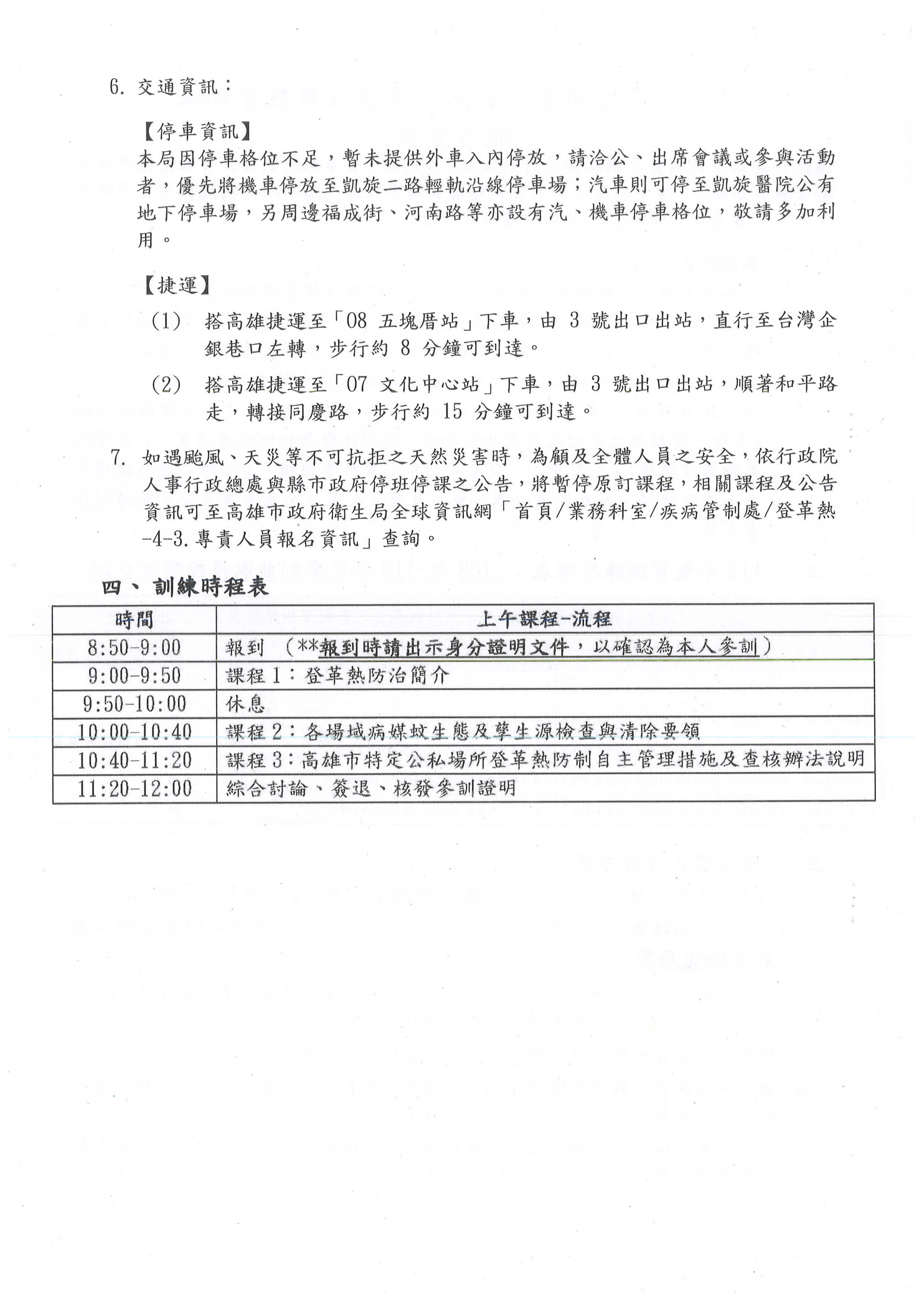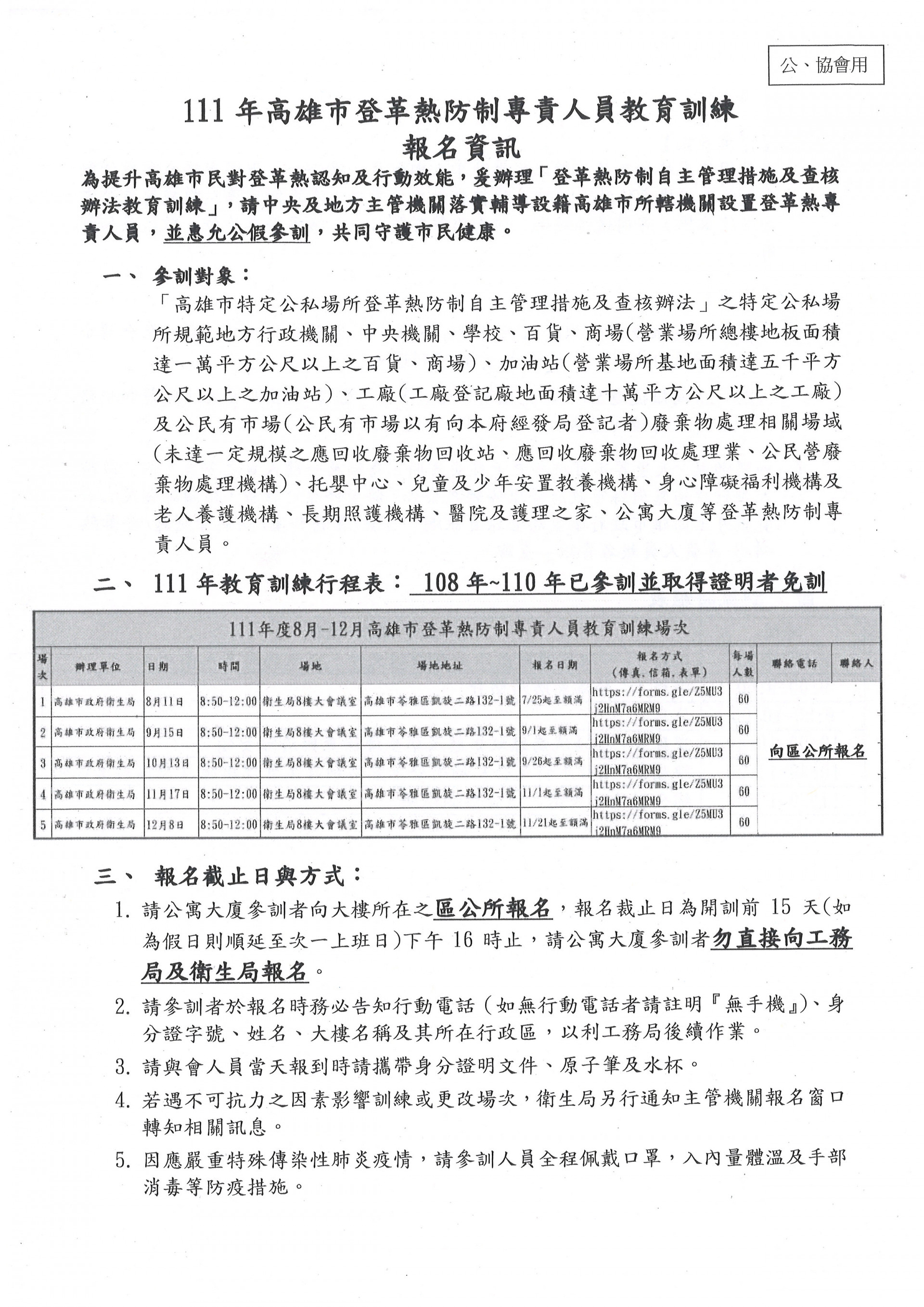 檢送本府衛生局及衛生所於111年8至12月舉辦[高雄市特定公私場所登革熱防制自主管理措施及查核辦法暨登革熱專責人員]教育訓練資訊