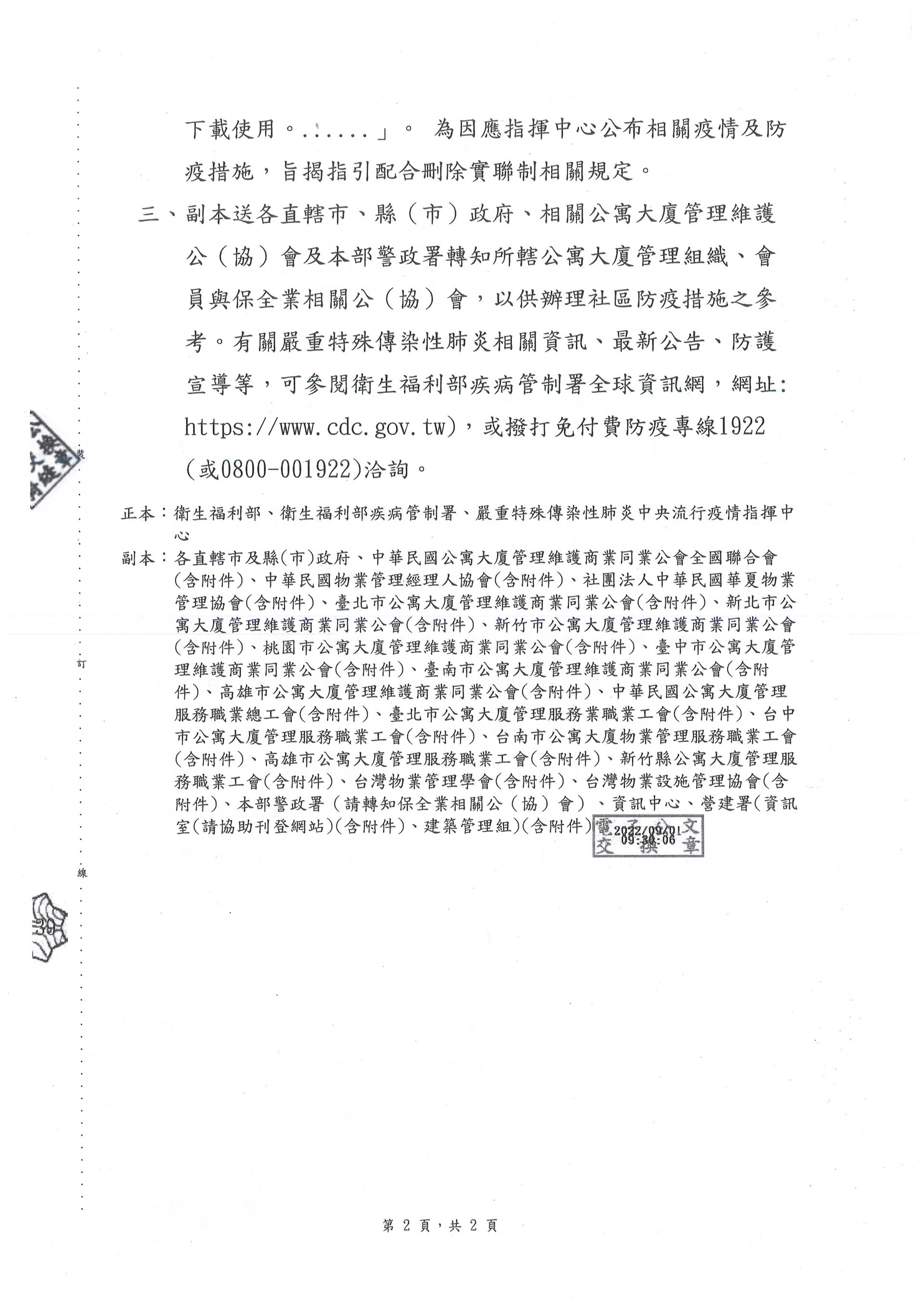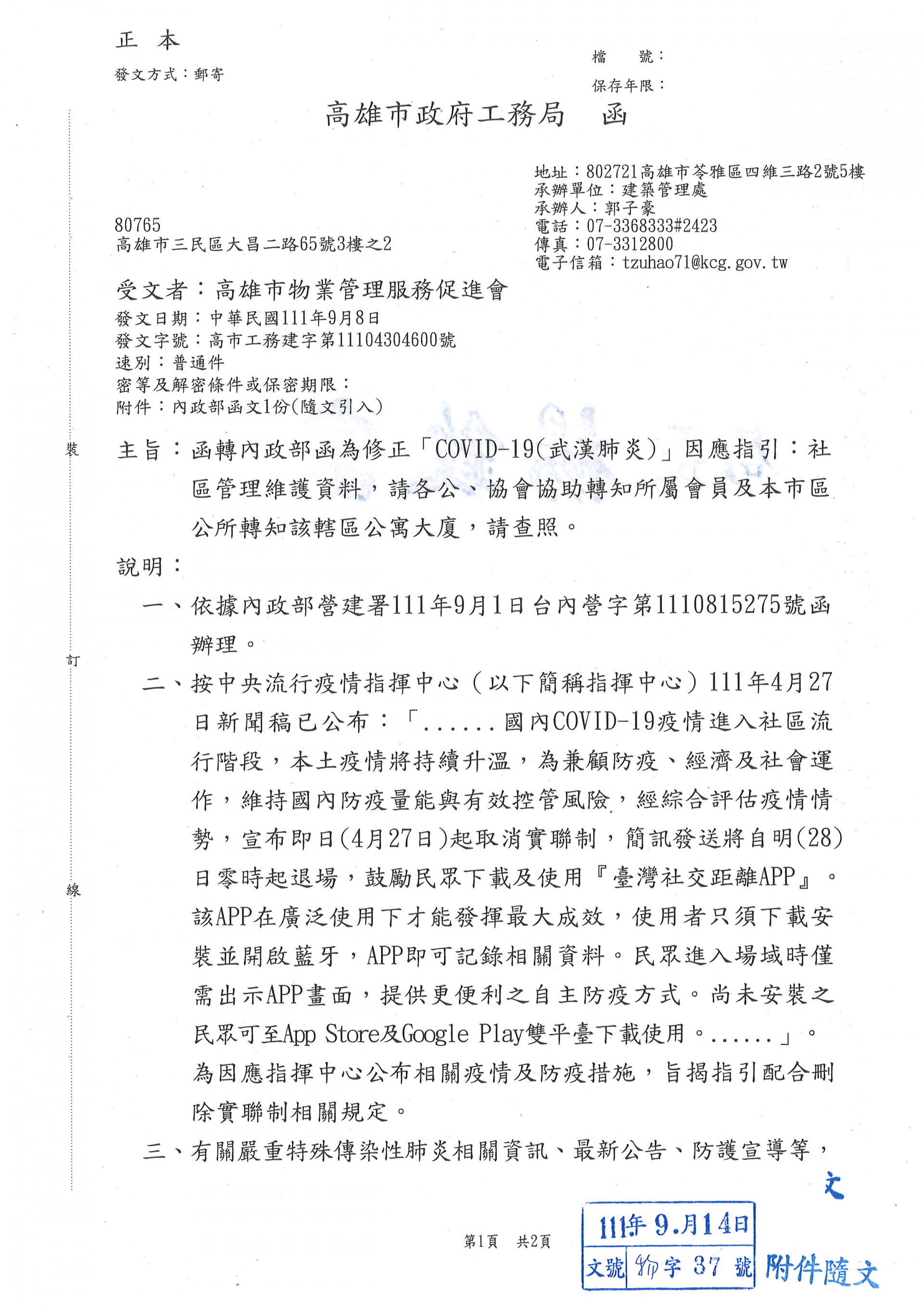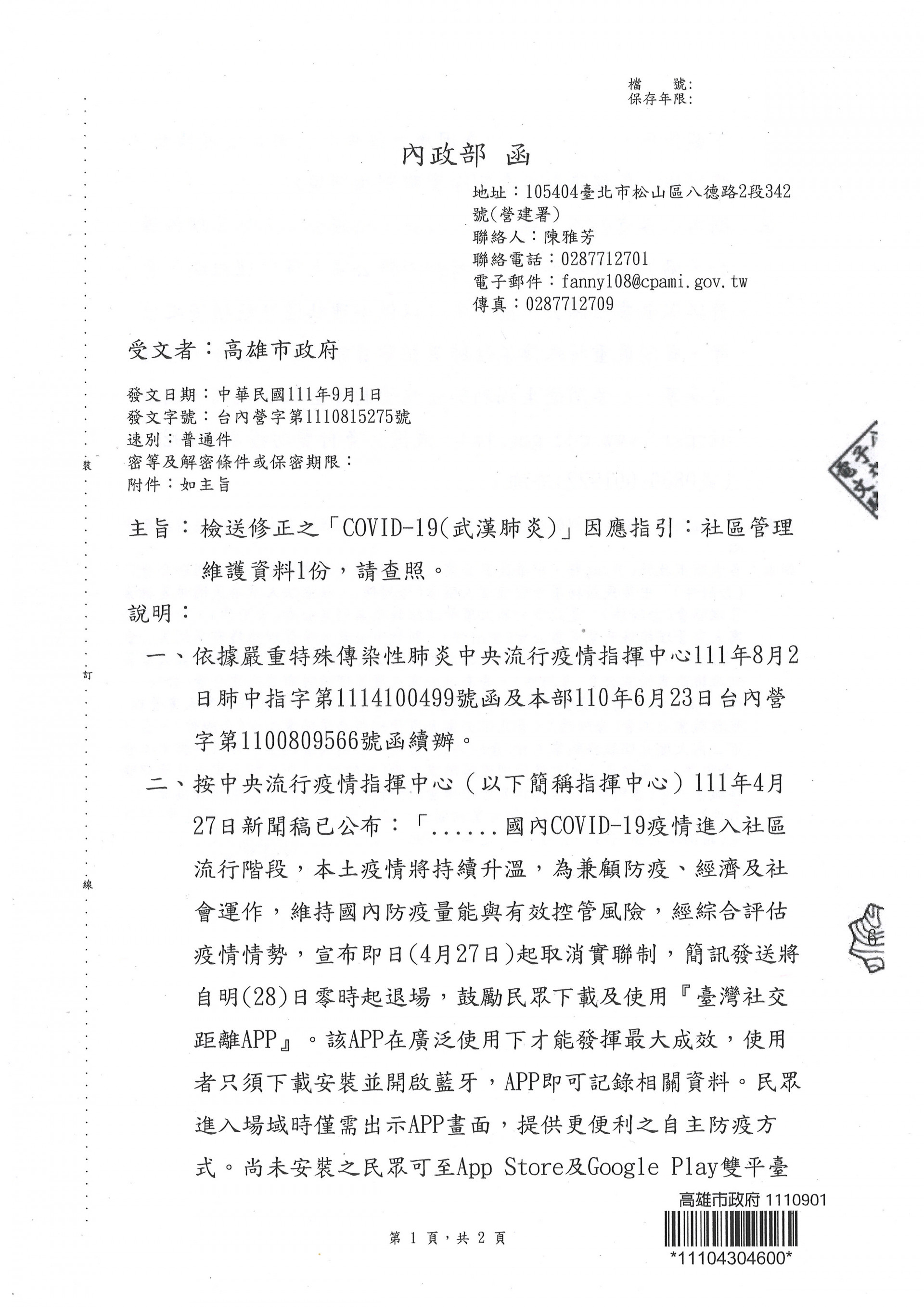 函轉內政部函為修正[COVID-19(武漢肺炎)]因應指引:社區管理維護資料