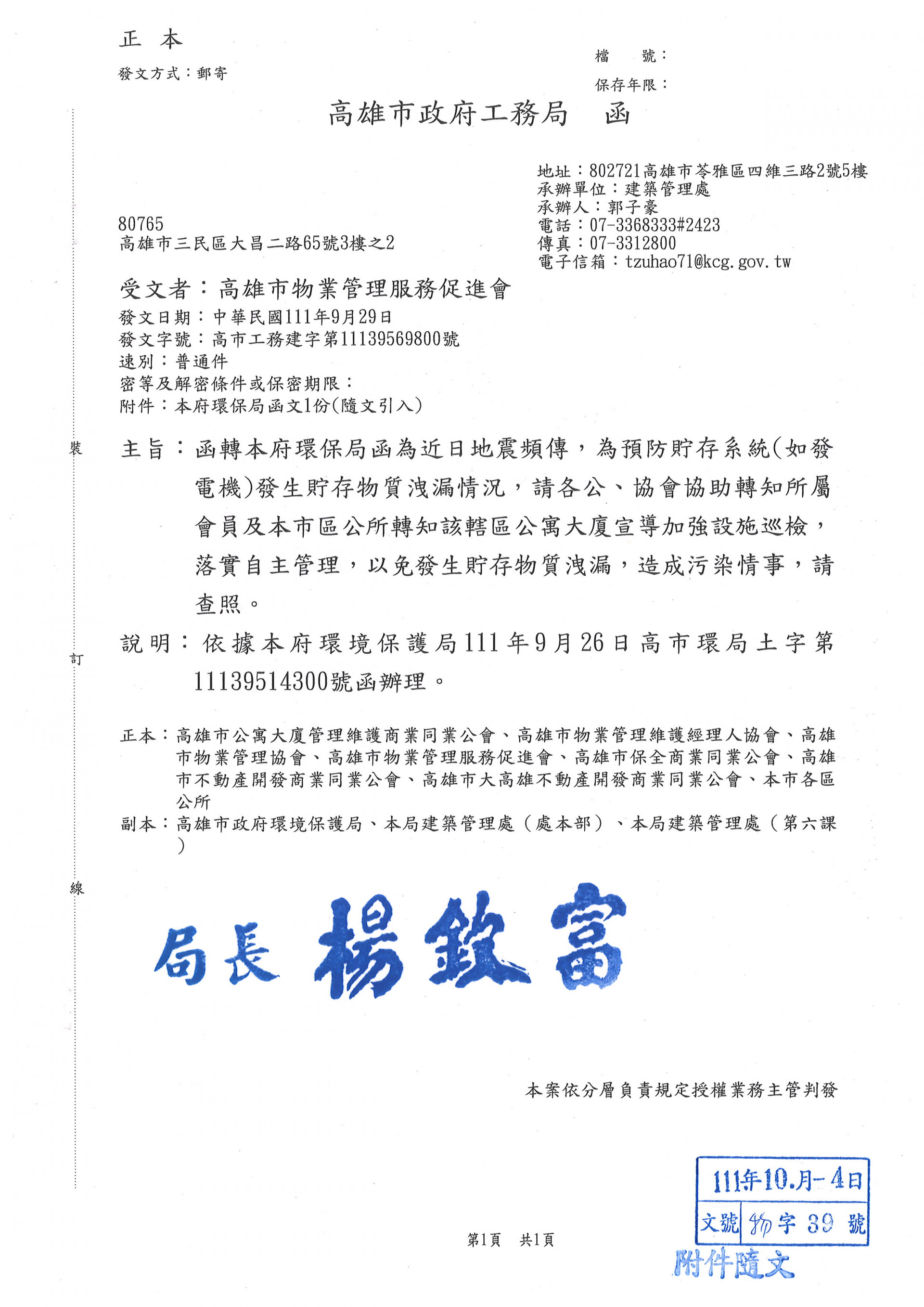 函轉本府環保局函為近日地震頻傳,為預防貯存系統(如發電機)發生貯存物質洩漏情形,宣導加強設施巡檢,落實自主管理,以免發生貯存物質洩漏,造成污染情事.
