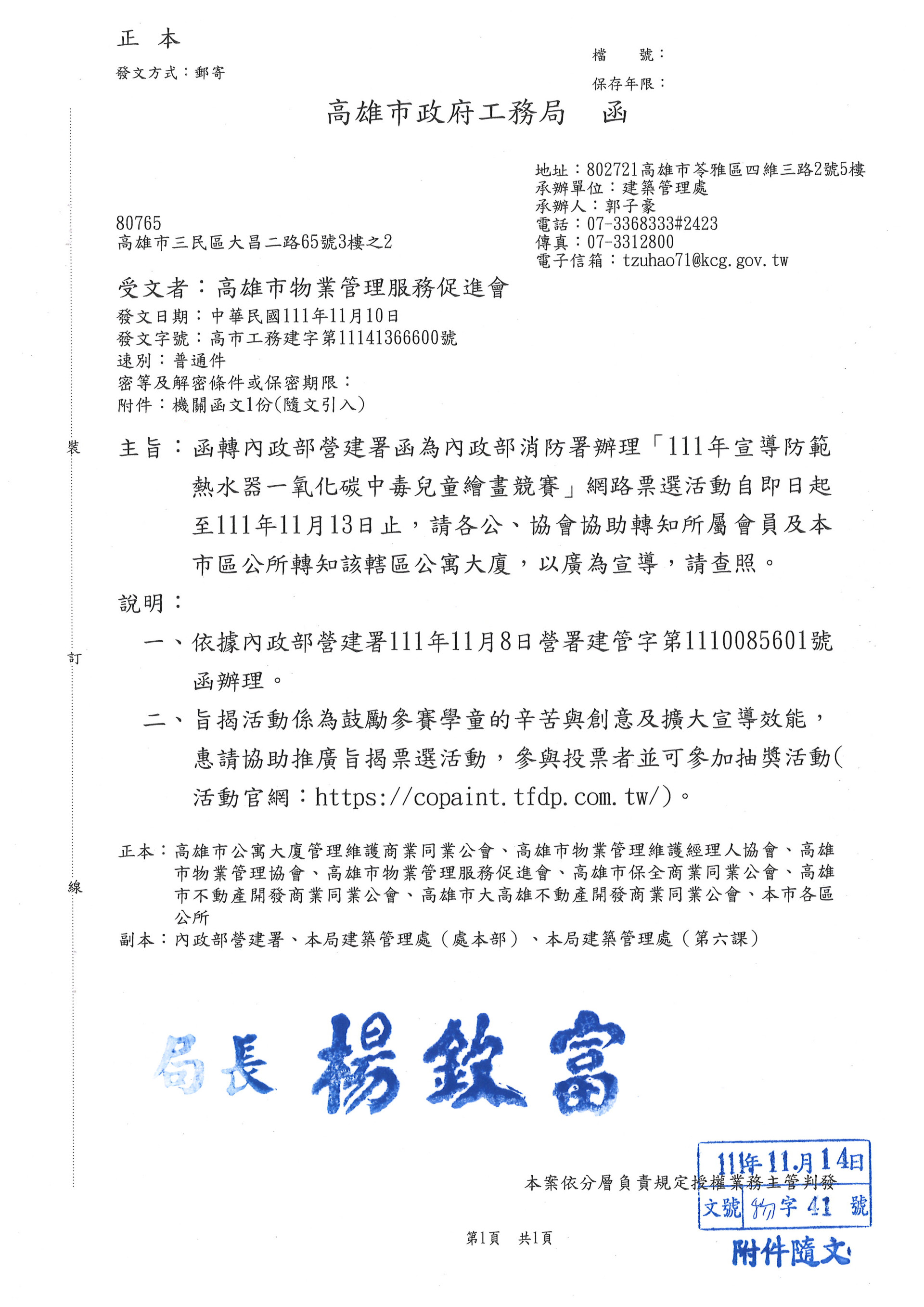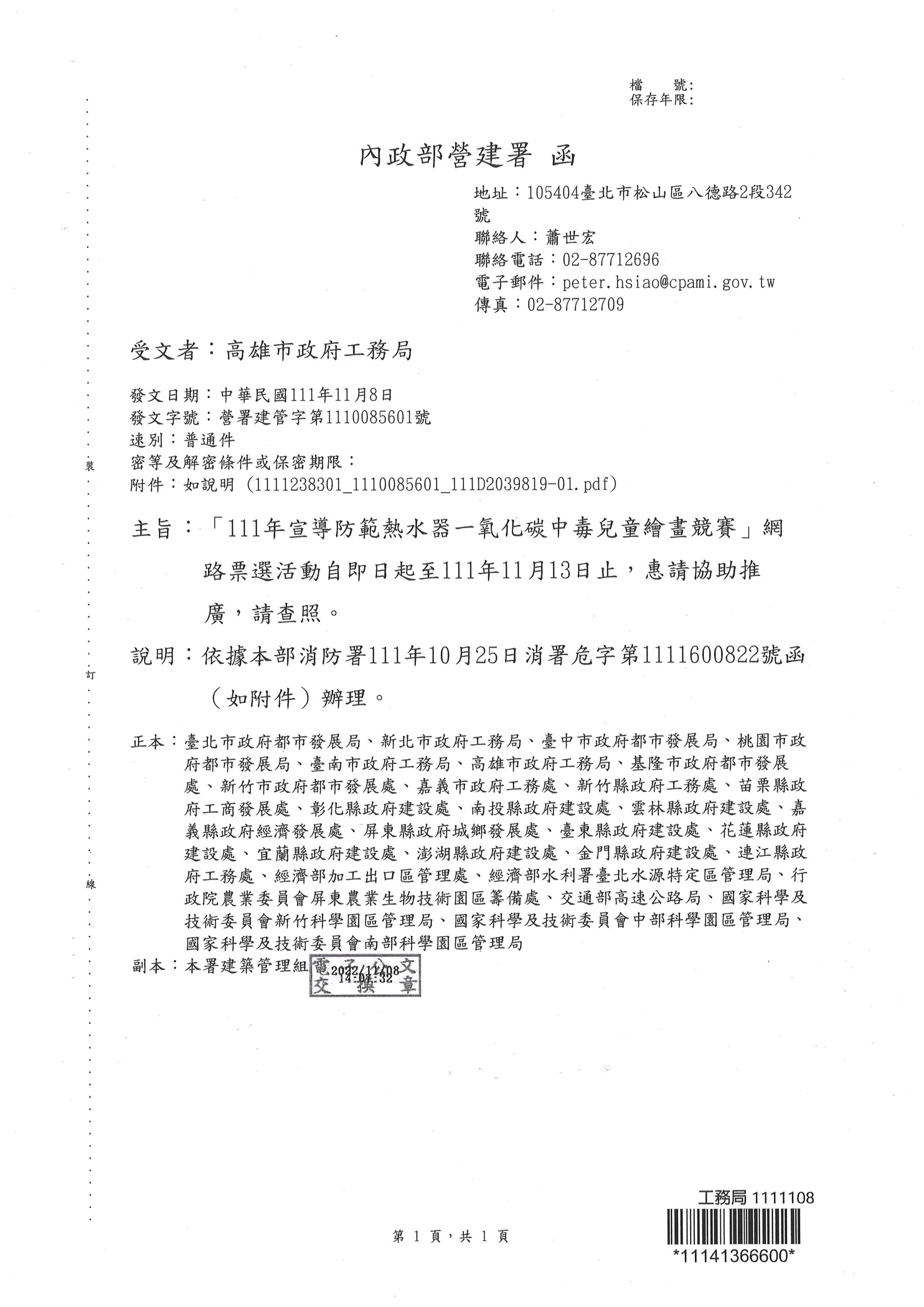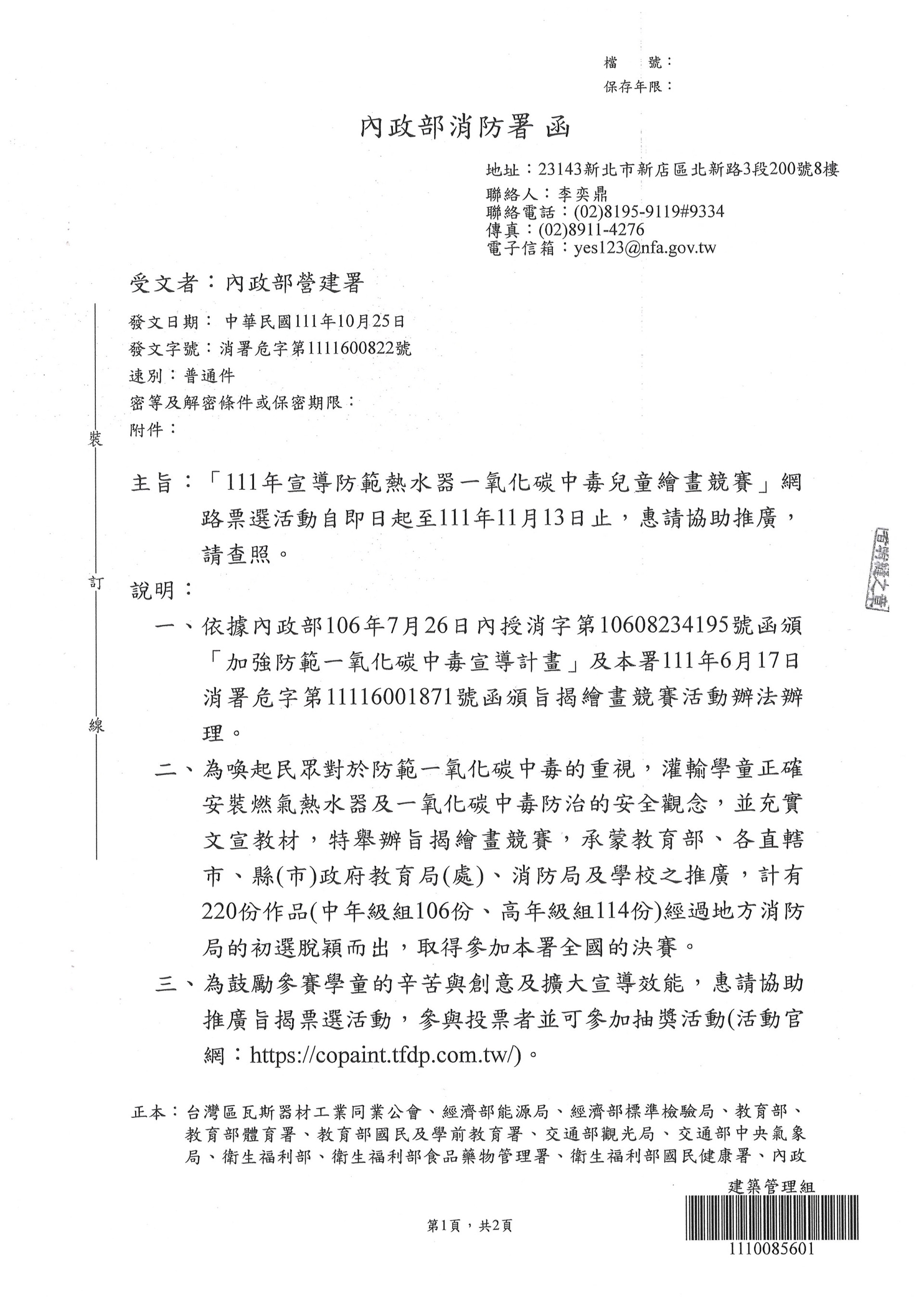 函轉內政部營建署函為內政部消防署辦理[111年宣導防範熱水器一氧化碳中毒兒童繪畫競賽]網路票選活動自即日起至111年11月13日止