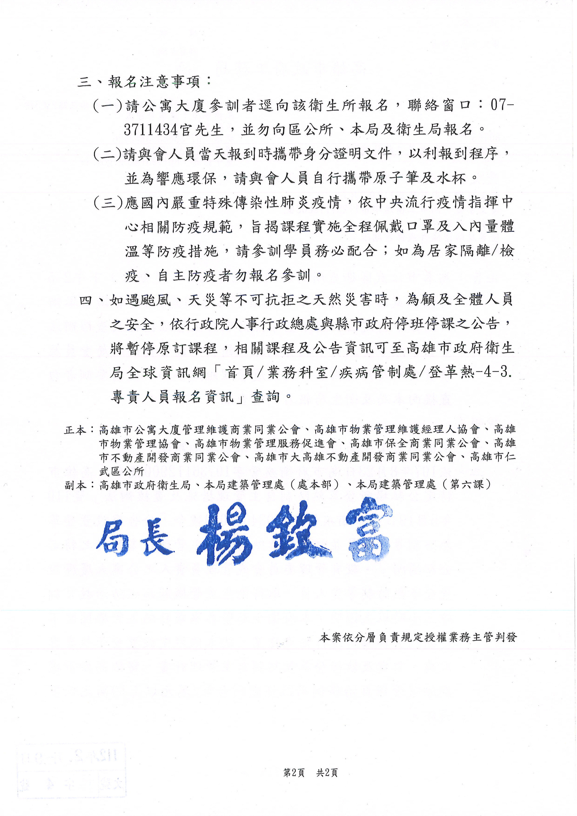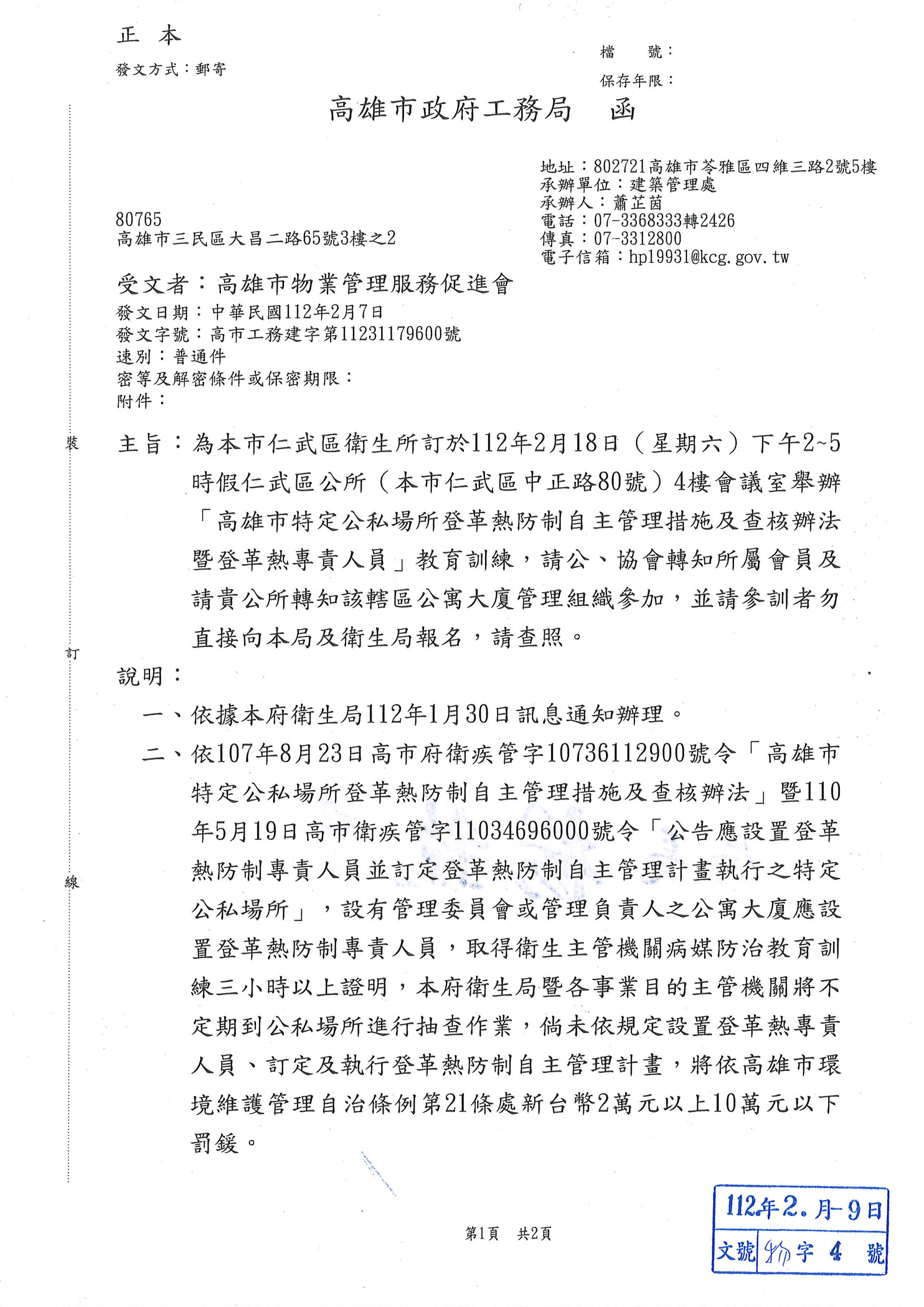 為本市仁武區衛生所於112年2月18日(六)下午2~5時假仁武區公所4樓會議室舉辦[高雄市特定公私場所登革熱防制自主管理措施及查核辦法暨登革熱專責人員]教育訓練