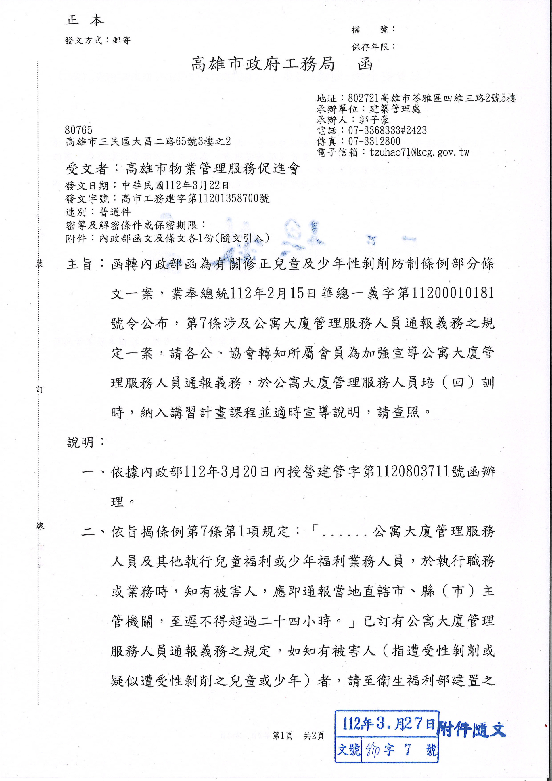 函轉內政部函為有關修正兒童及少年性剥削防制條例部分條文一案,業奉總統112年2月15日華總一義字第11200010181號令公布,第7條涉及公寓大廈管理服務人員通報義務之規定一案