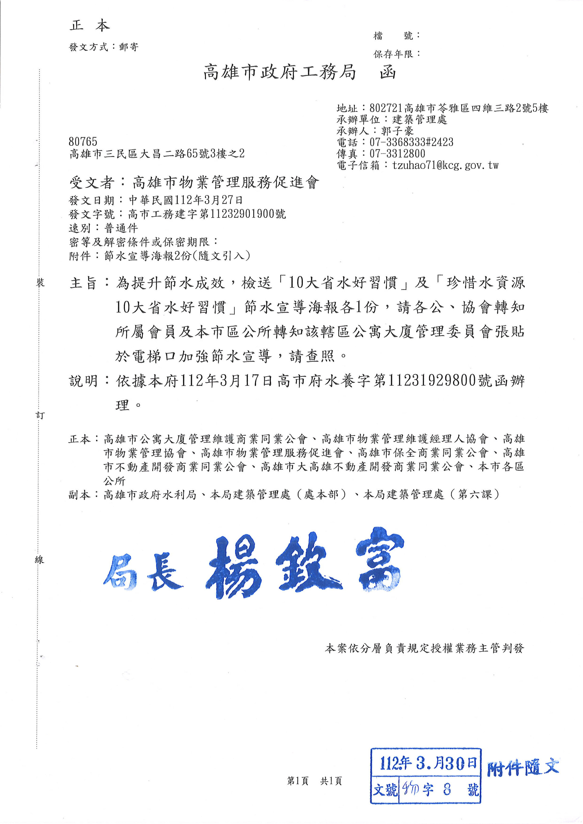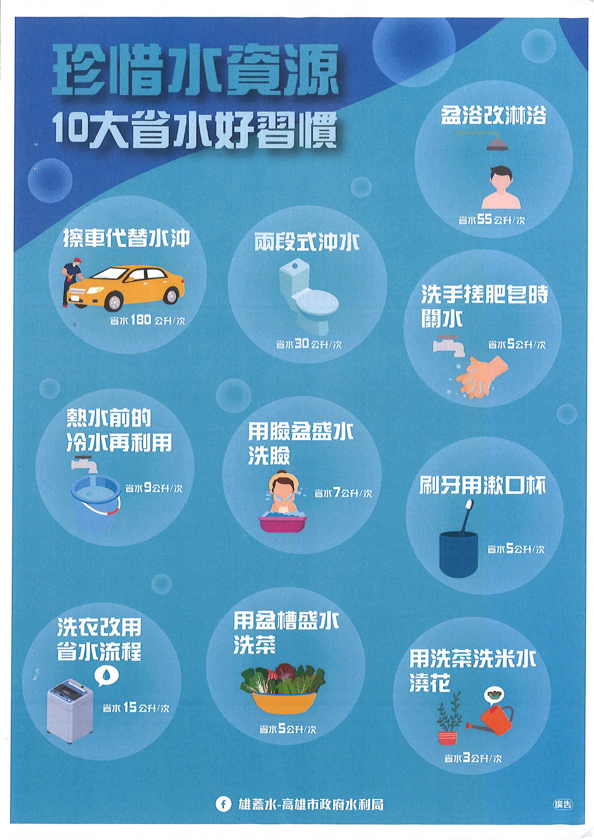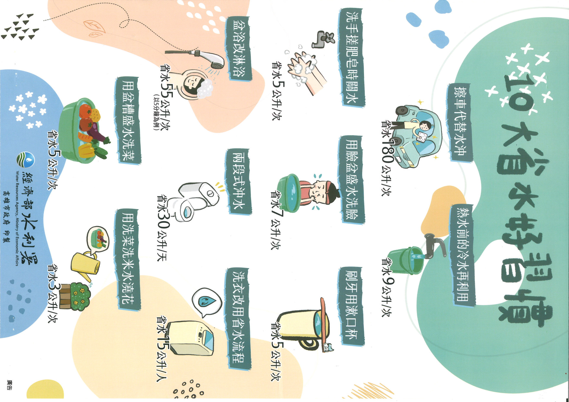 為提升節水成效,檢送[10大省水好習慣]及[珍惜水資源10大省水好習慣]節水宣導海報