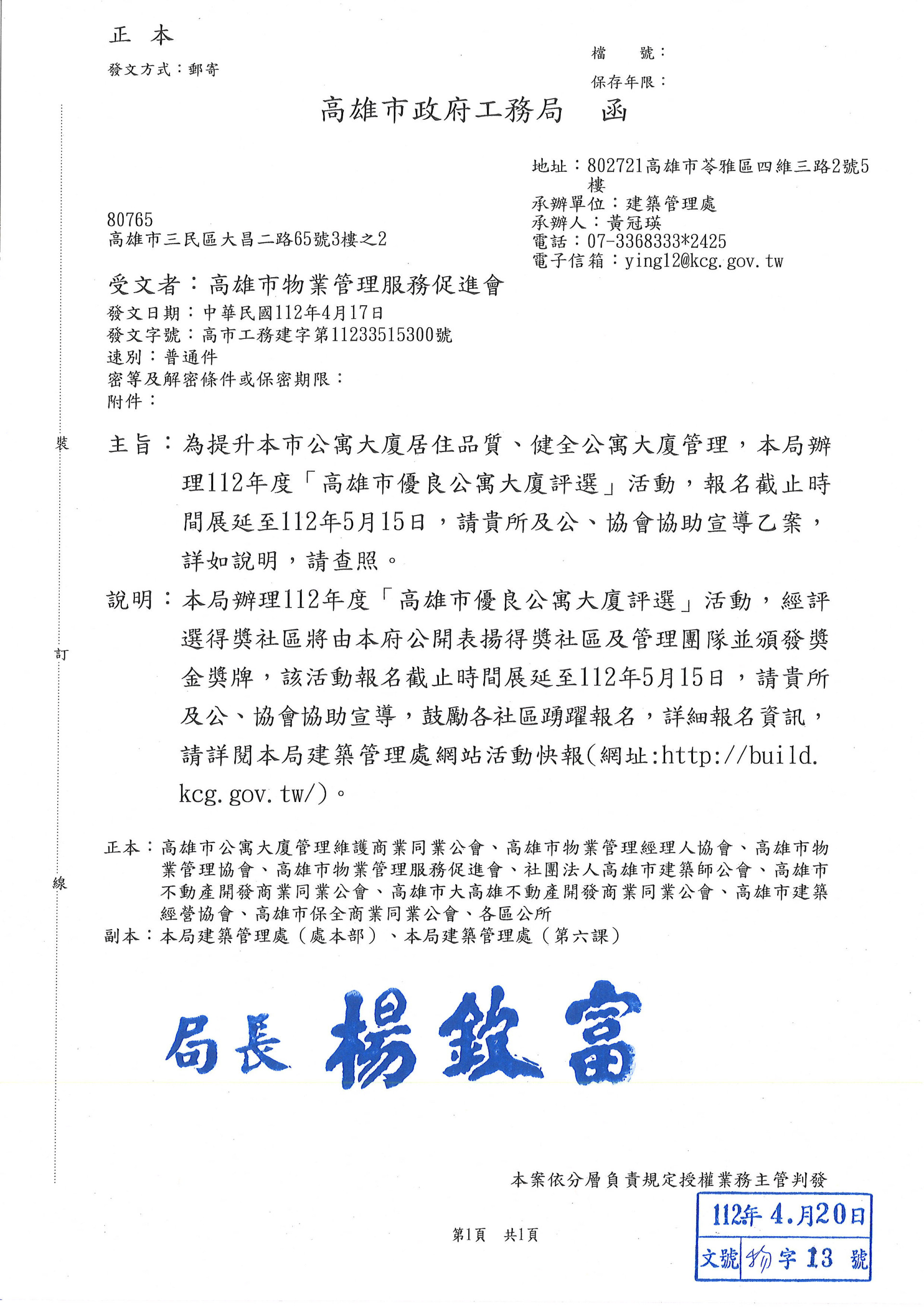 本局辧理112年度[高雄市優良公寓大廈評選],報名截止展延至112年5月15日