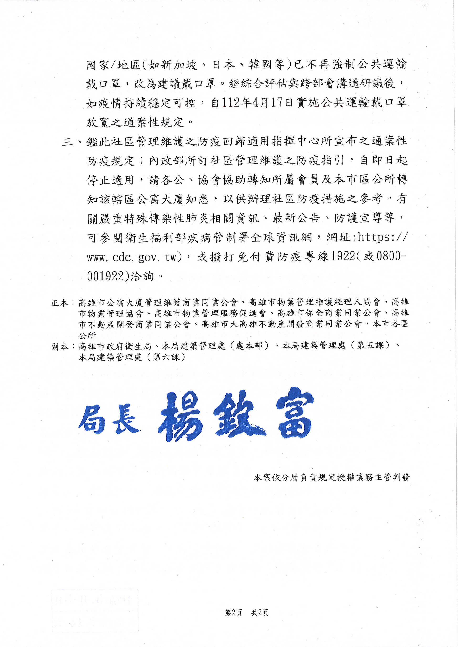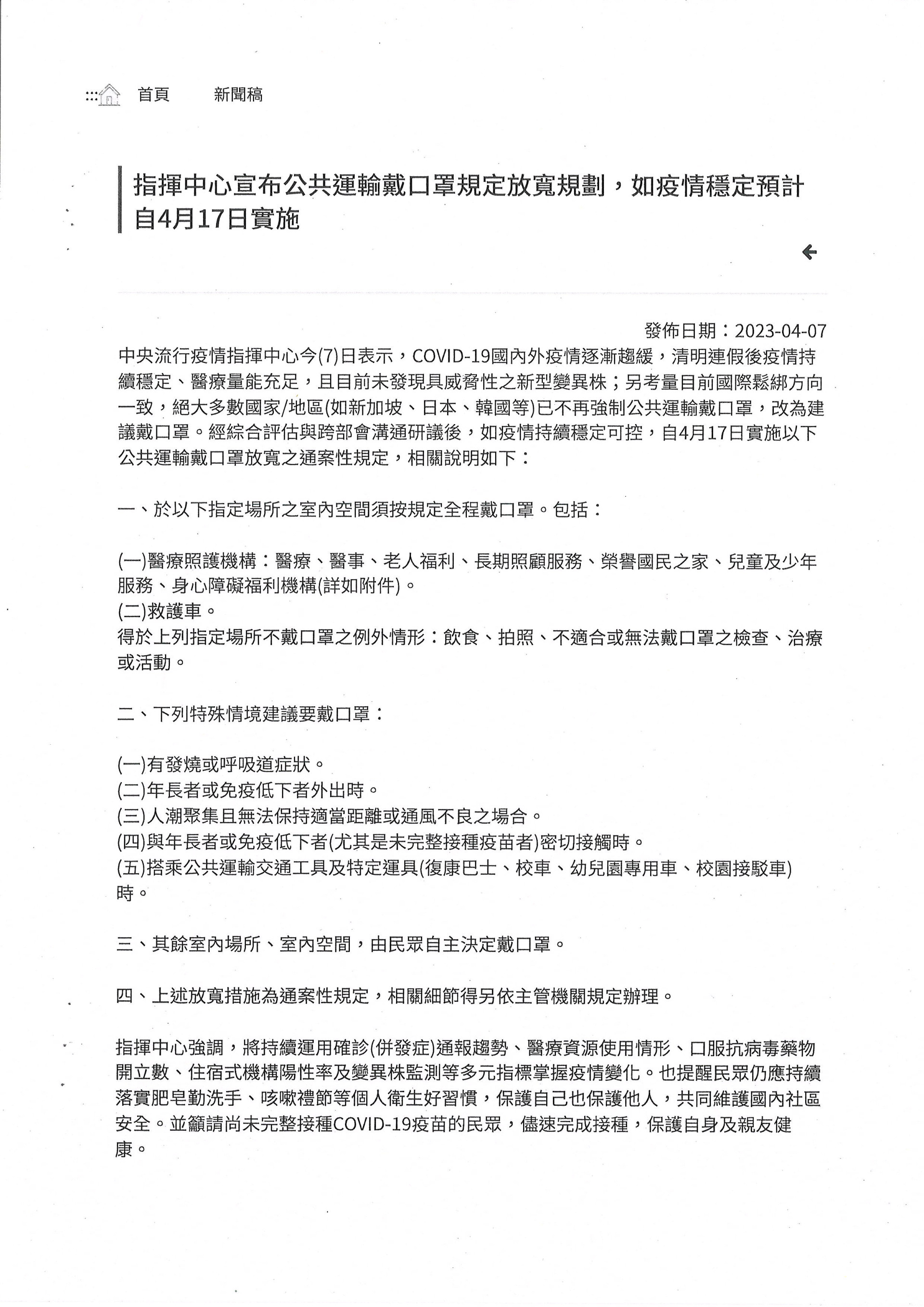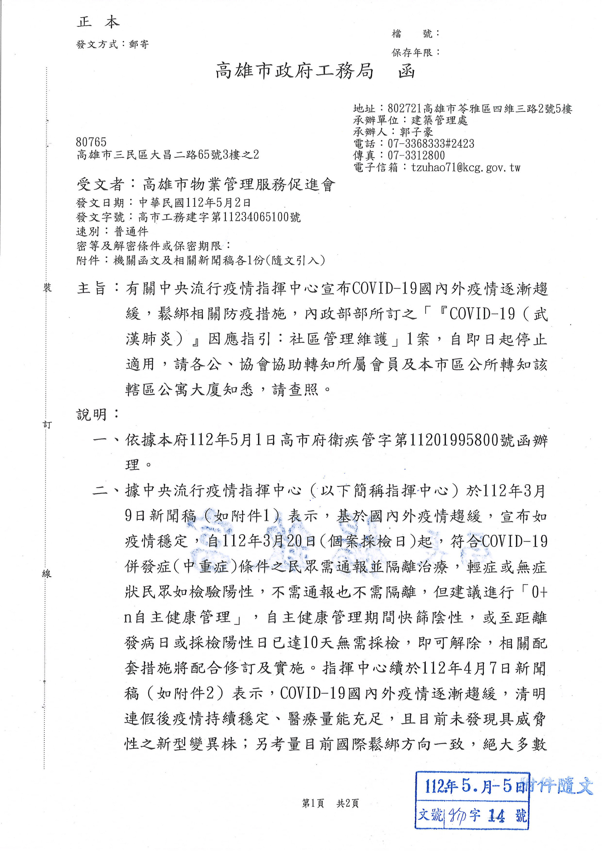中央流行疫情指揮中心宣佈COVID-19相關防疫措施鬆綁,內政部所訂「武漢肺炎(COVID-19)因應指引:社區管理維護」自即日起停止適用