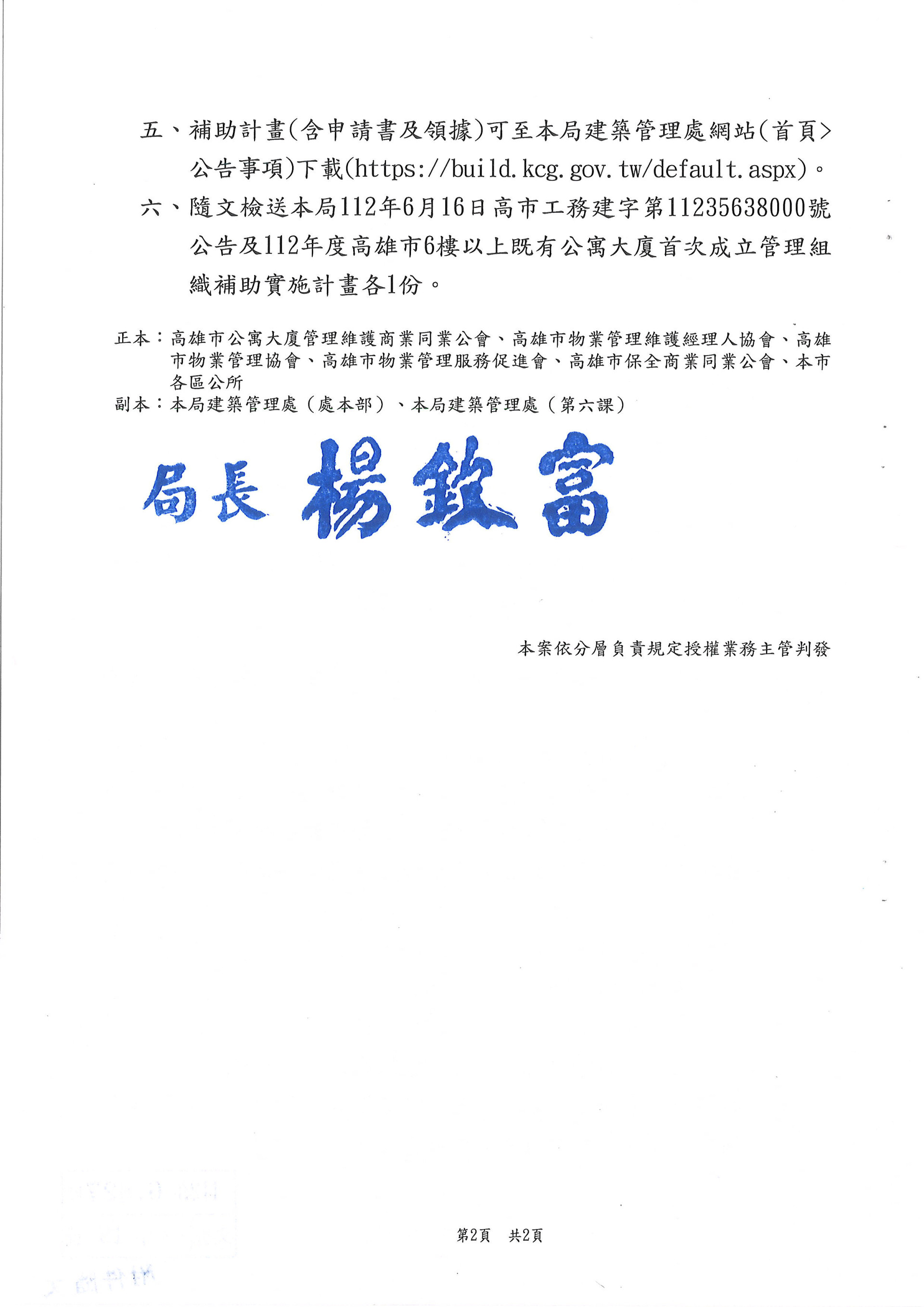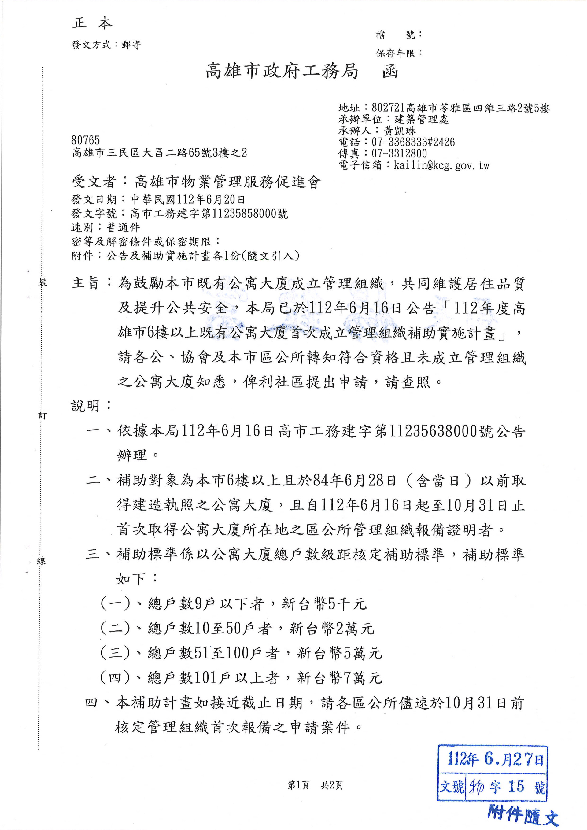 為鼓勵既有公寓大廈成立管理組織,共同維護居住品質瓪提升公共安全,本局已於112/06/06公告「112年度高雄市6樓以上既有公寓大廈首次成立管理組織補助實施計畫」