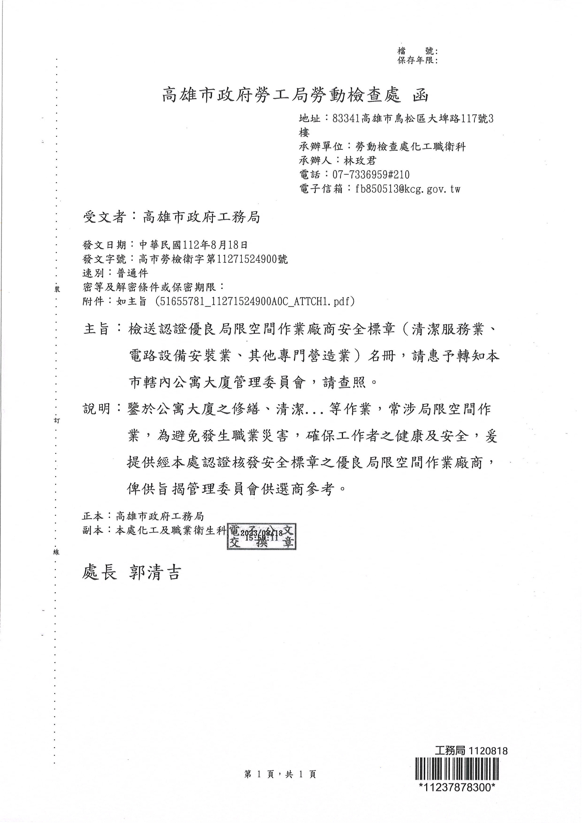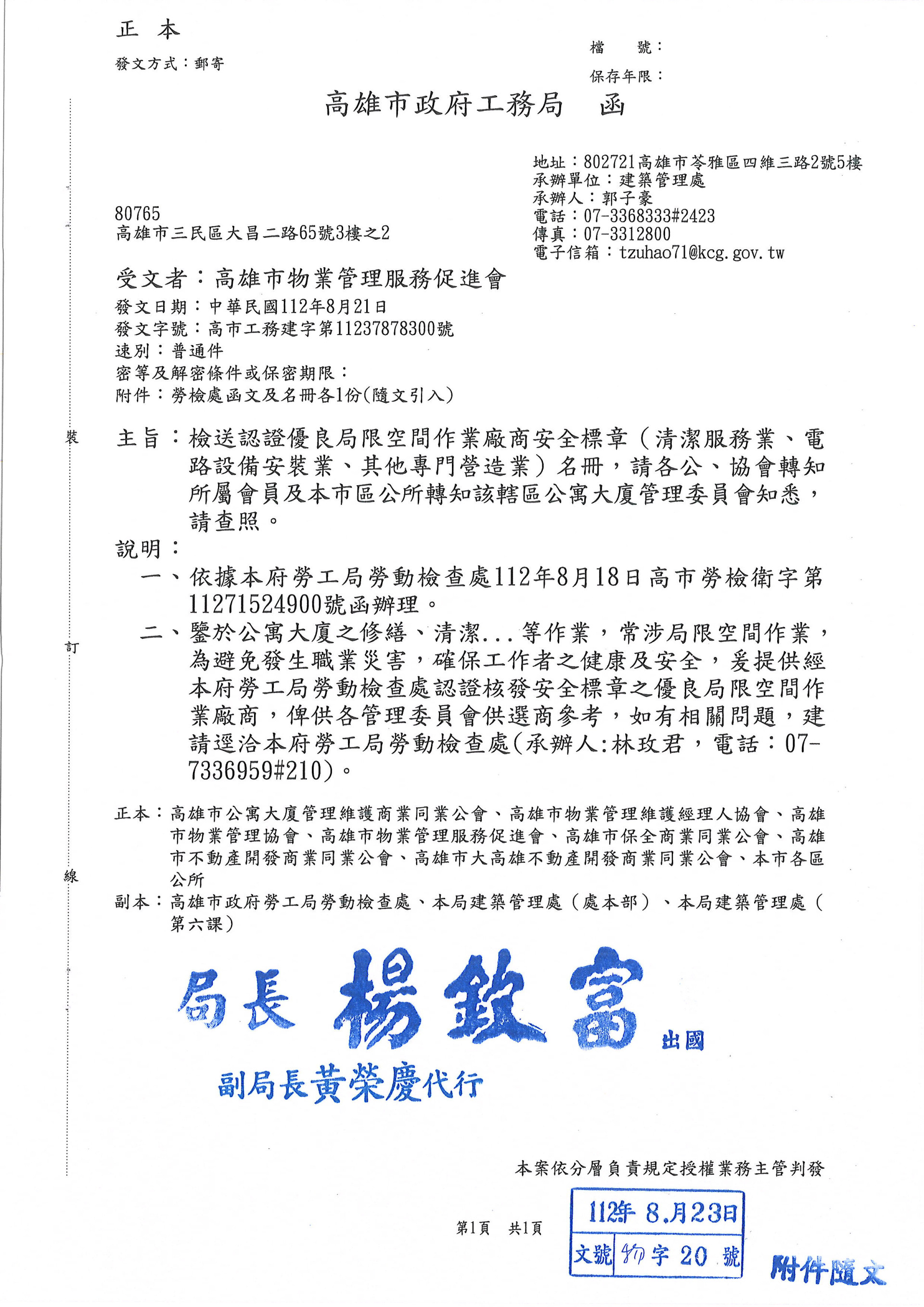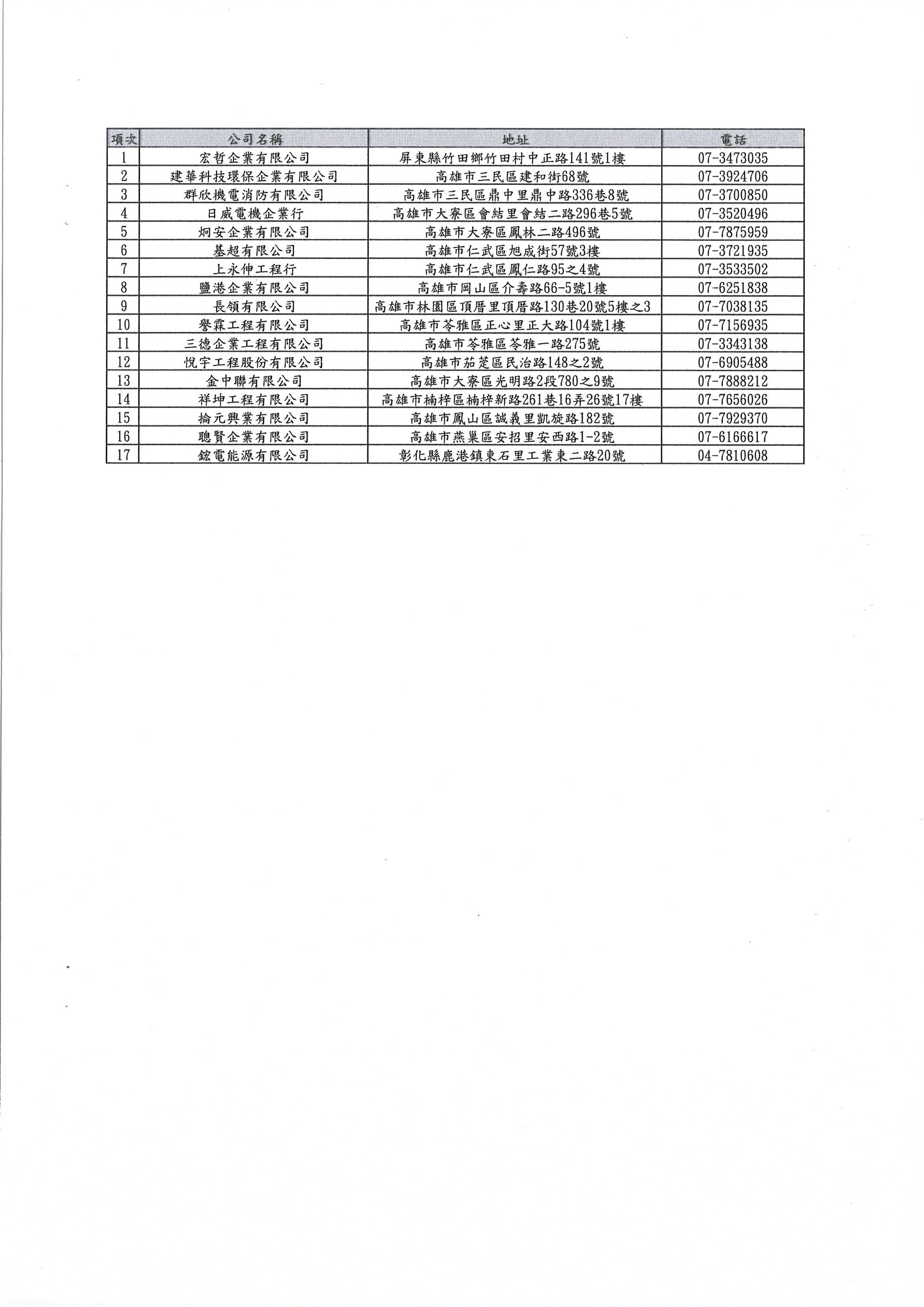檢送認證優良局限空間作業廠商安全標章(清潔服務業、電路設備安裝業、其他專門營造業)名冊