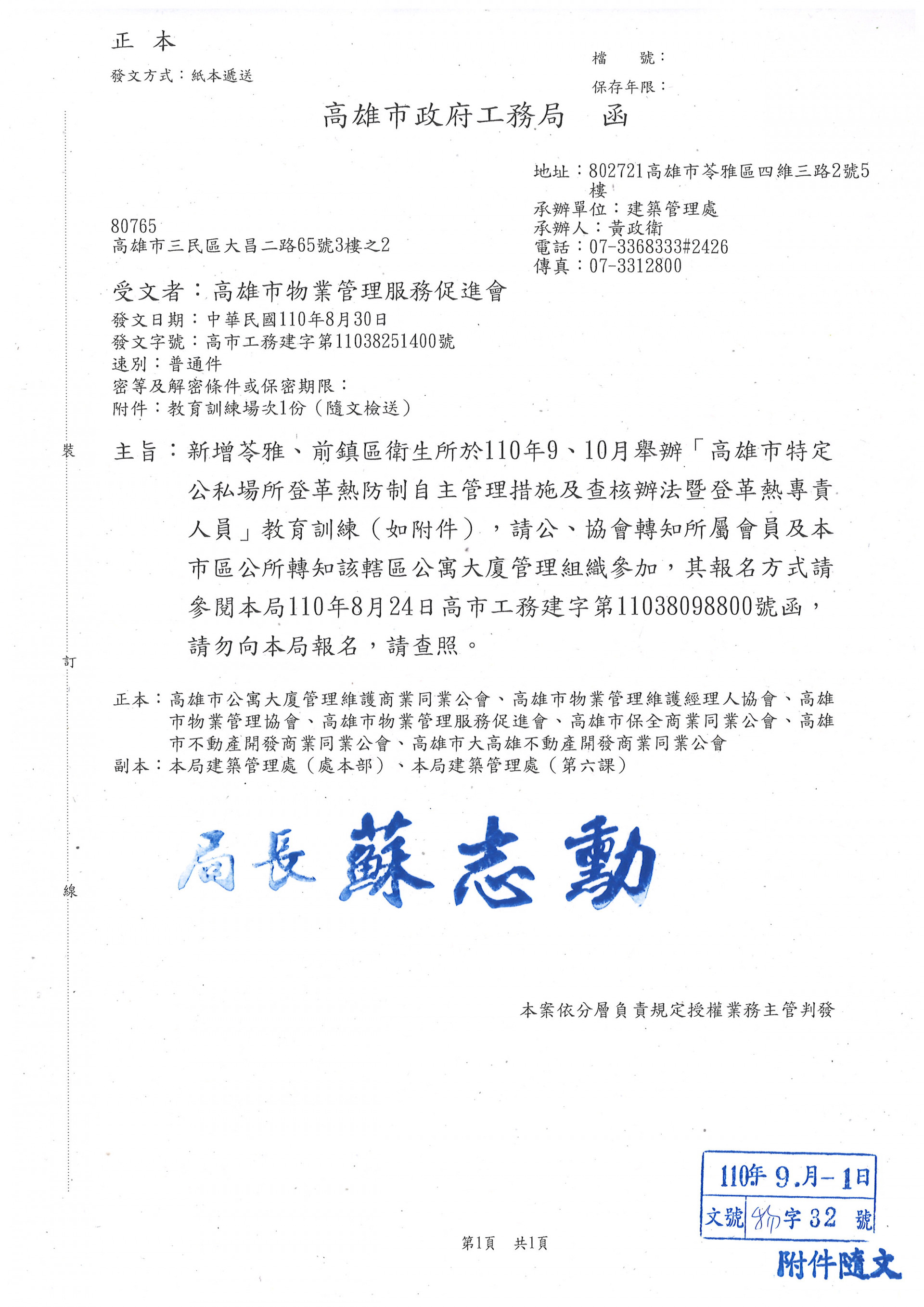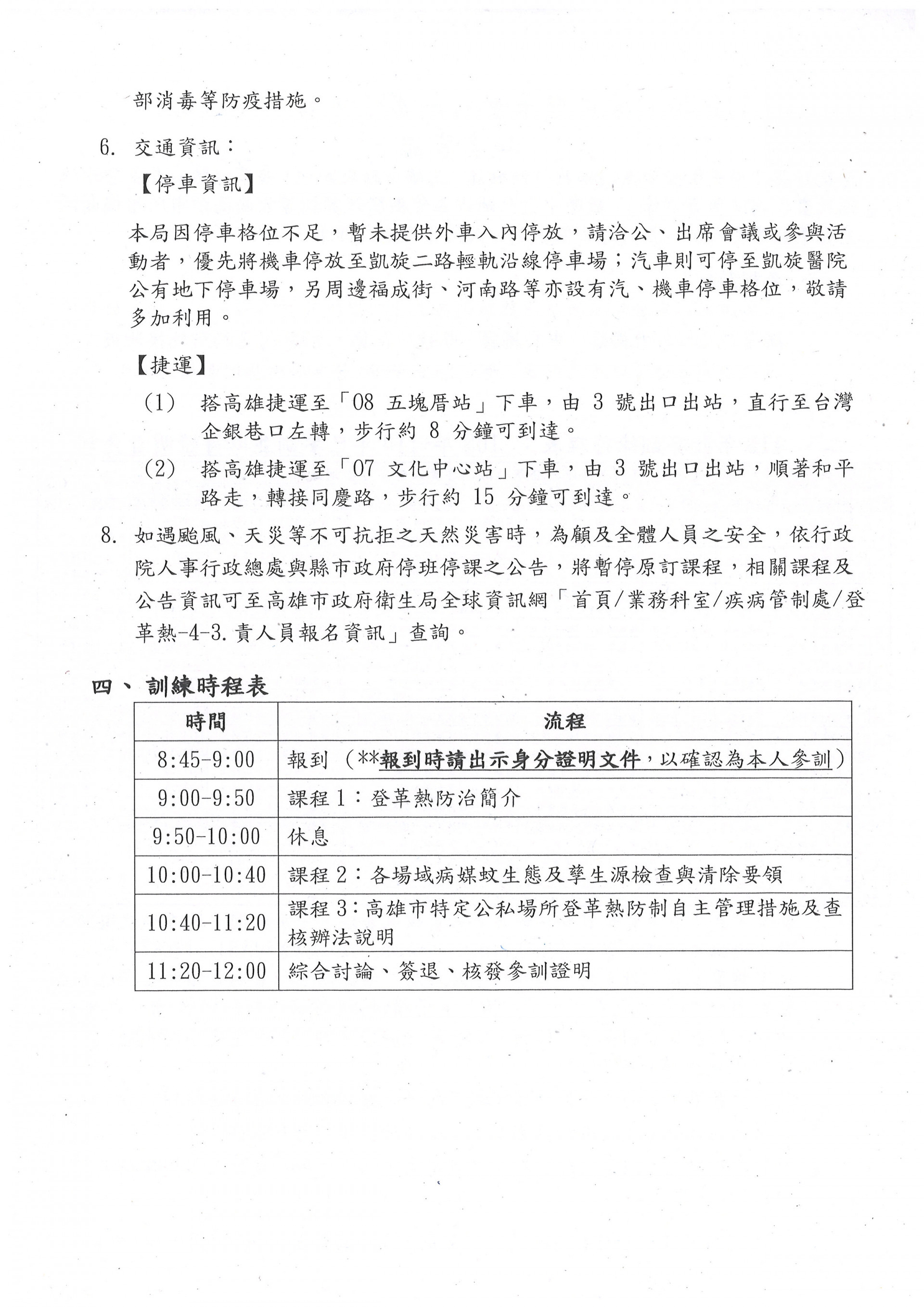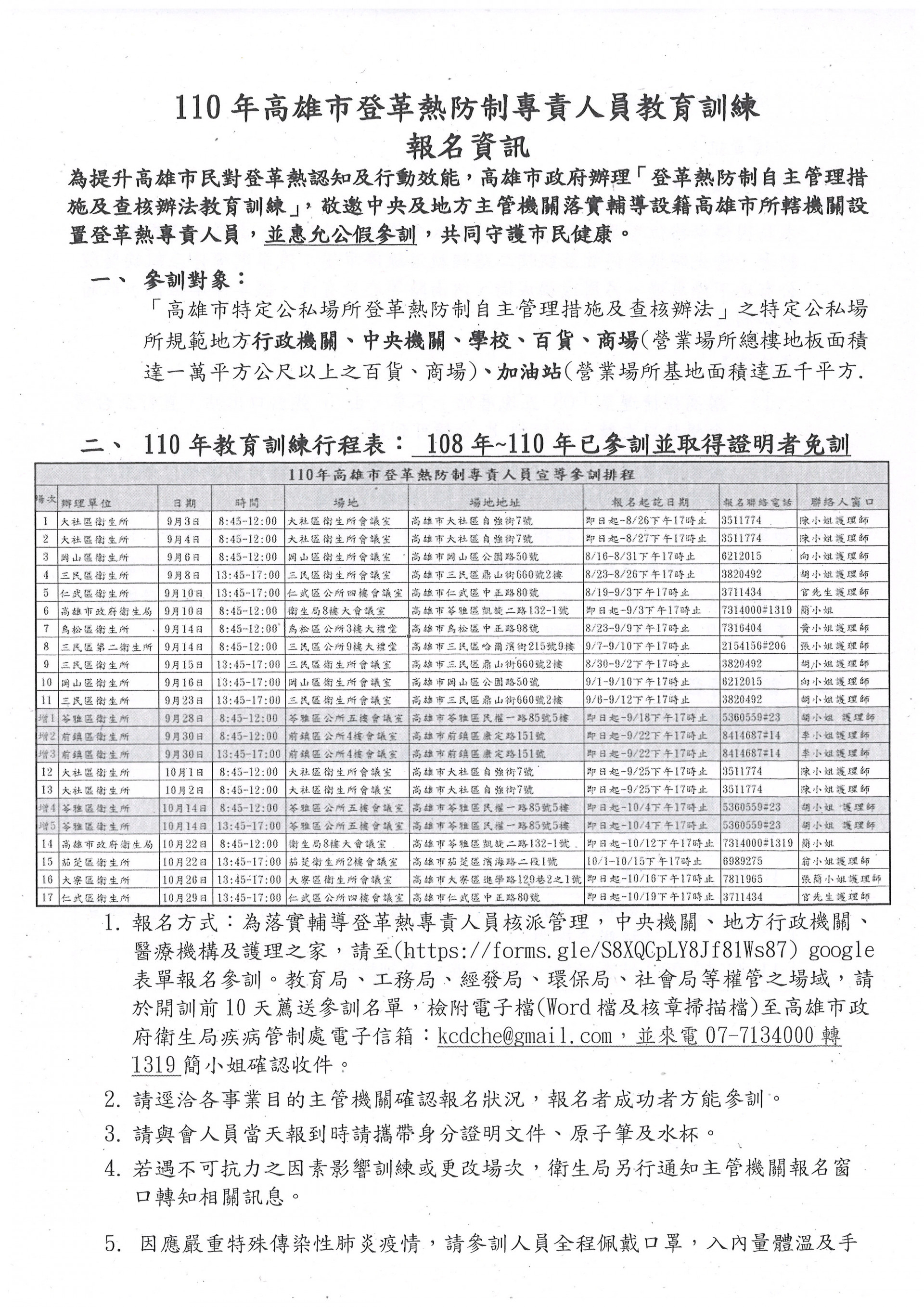 新增苓雅、前鎮區衛生所於110年9、10月舉辦[高雄市特定公私場所登革熱防制自主管理措施及查核辦法暨登革熱專責人員]教育訓練