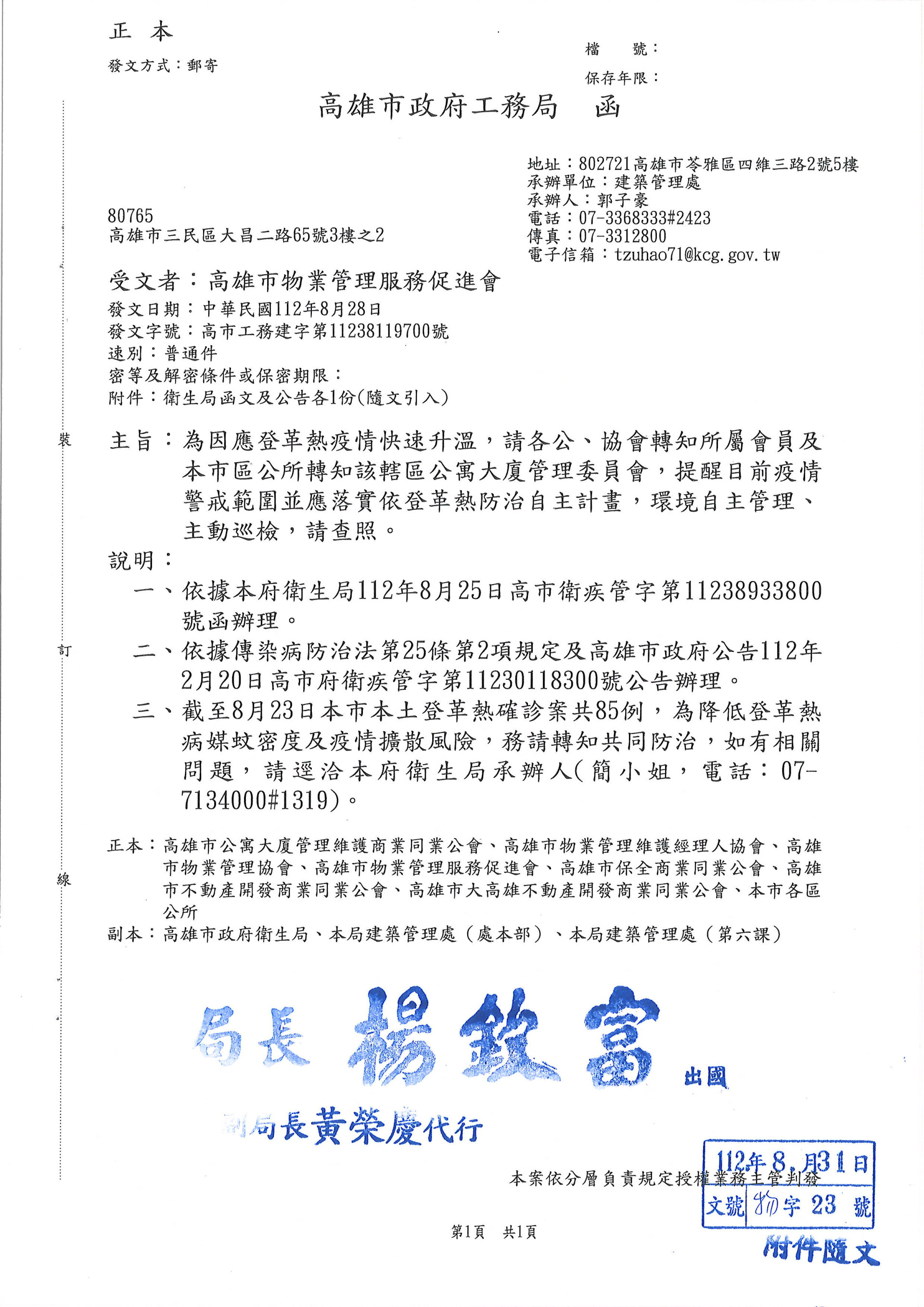 為因應登革熱疫情快速升溫,請轉知各公寓大廈委委會,提醒目前疫情警戒範圍並應落實依登革熱防治自主計畫,環境自主管理、主動巡檢