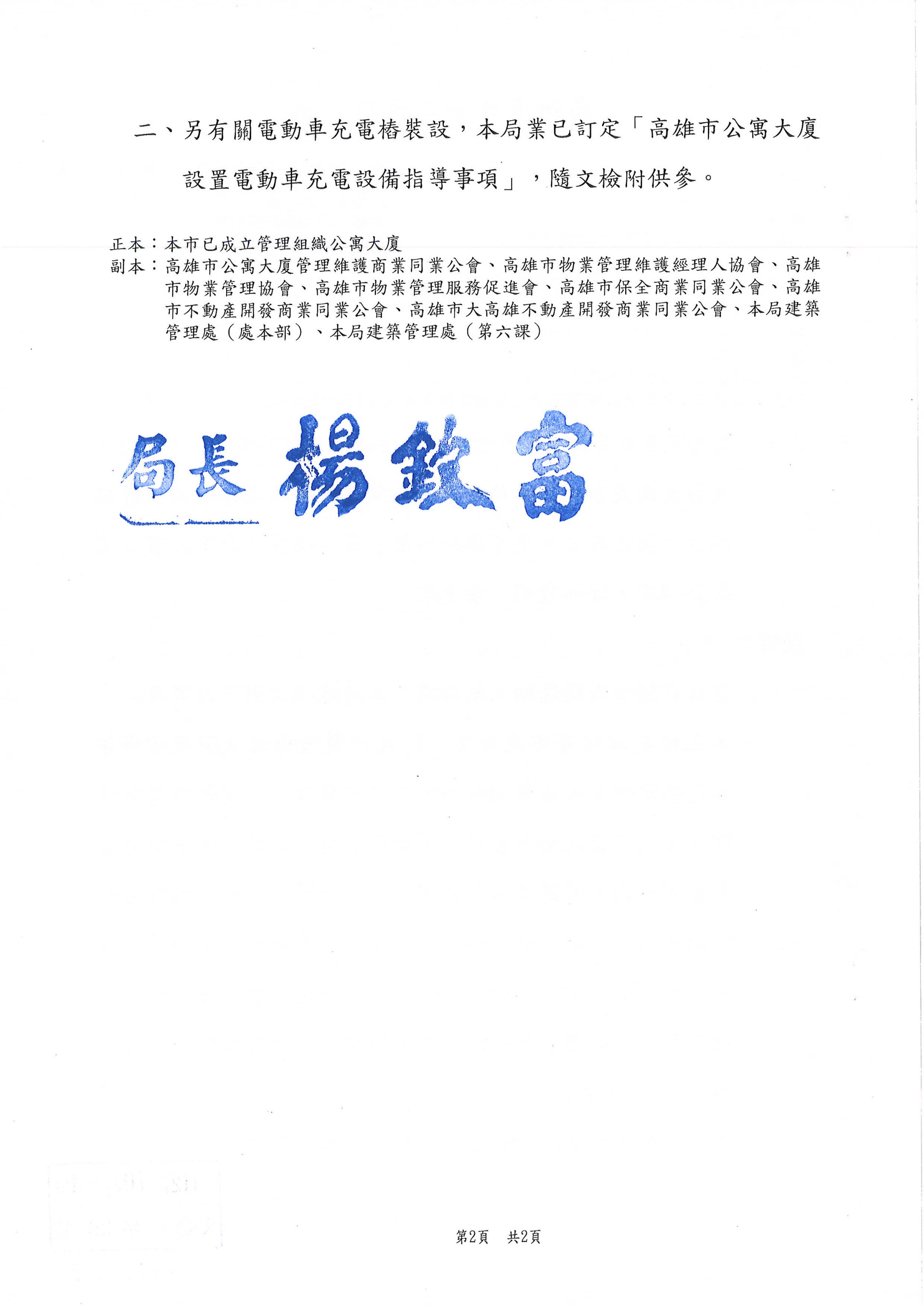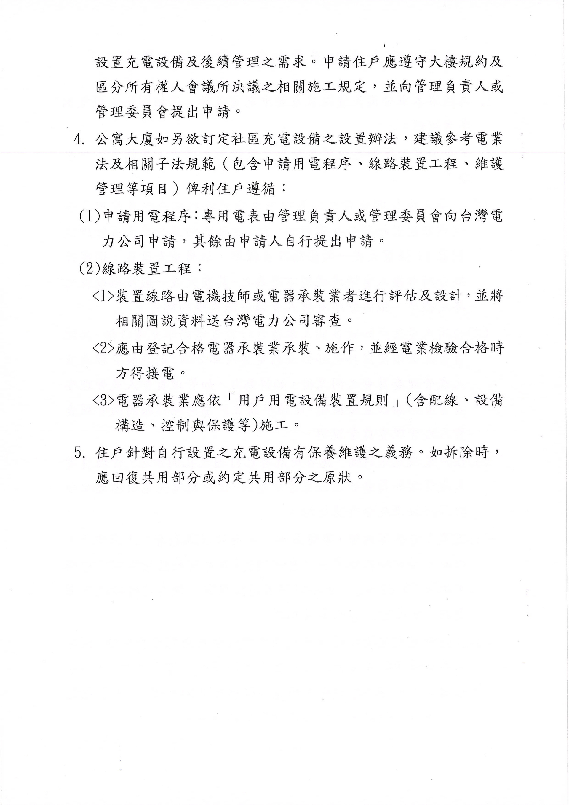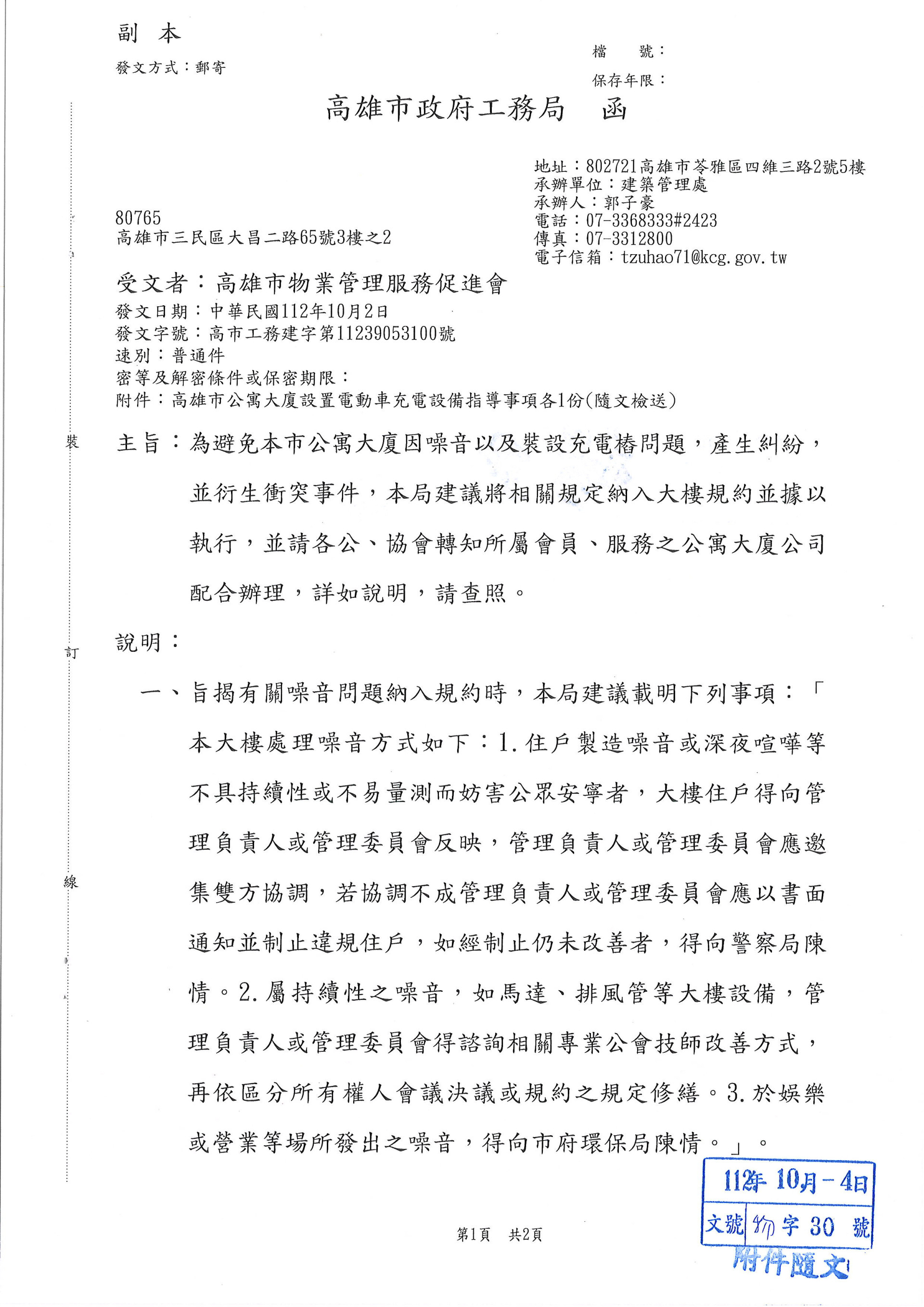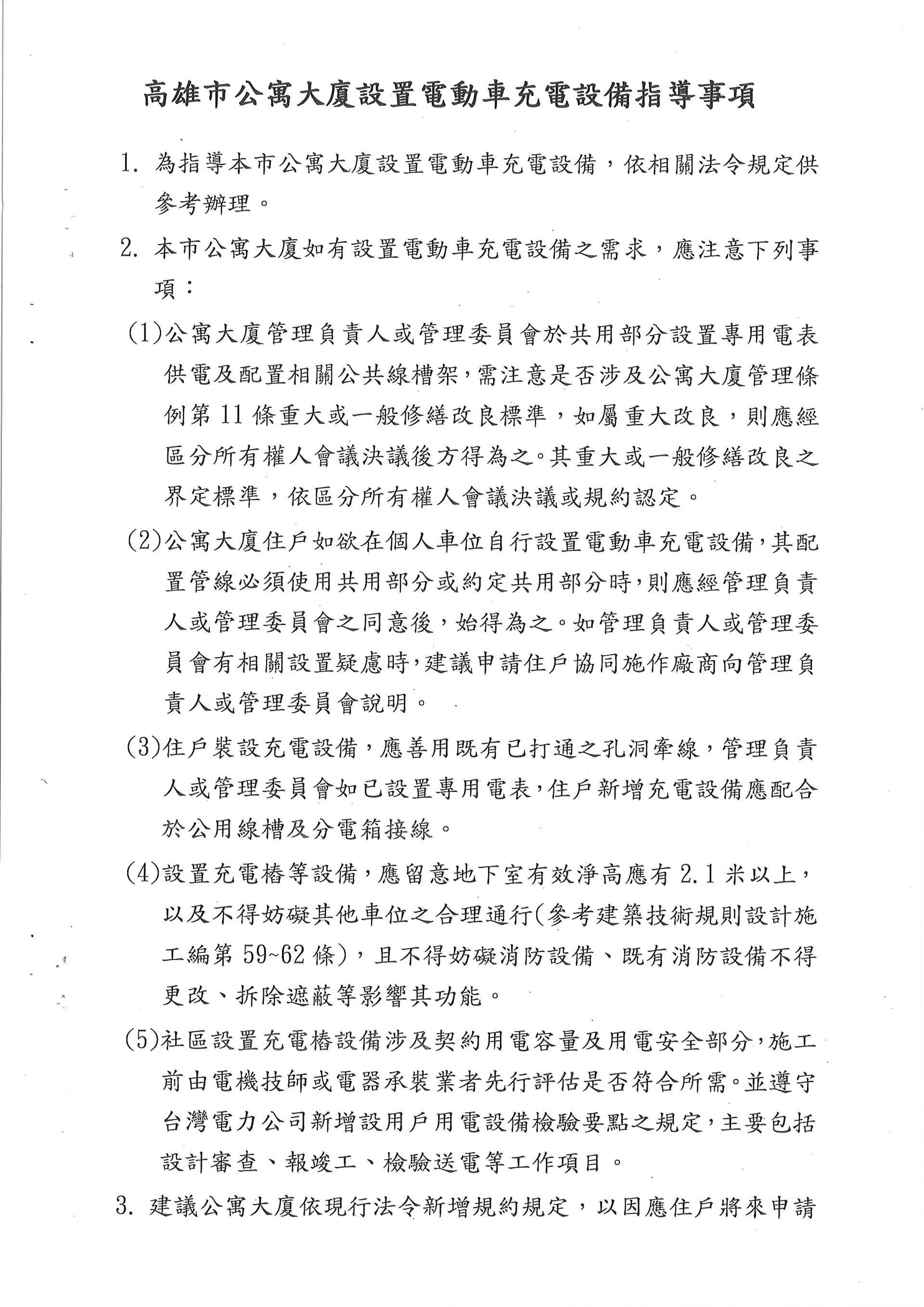 為避免本市公寓大廈因噪音以及裝設充電椿問題,產生糾紛,並衍生衝突事件,本局建議將相關規定納入大樓規約並據以執行