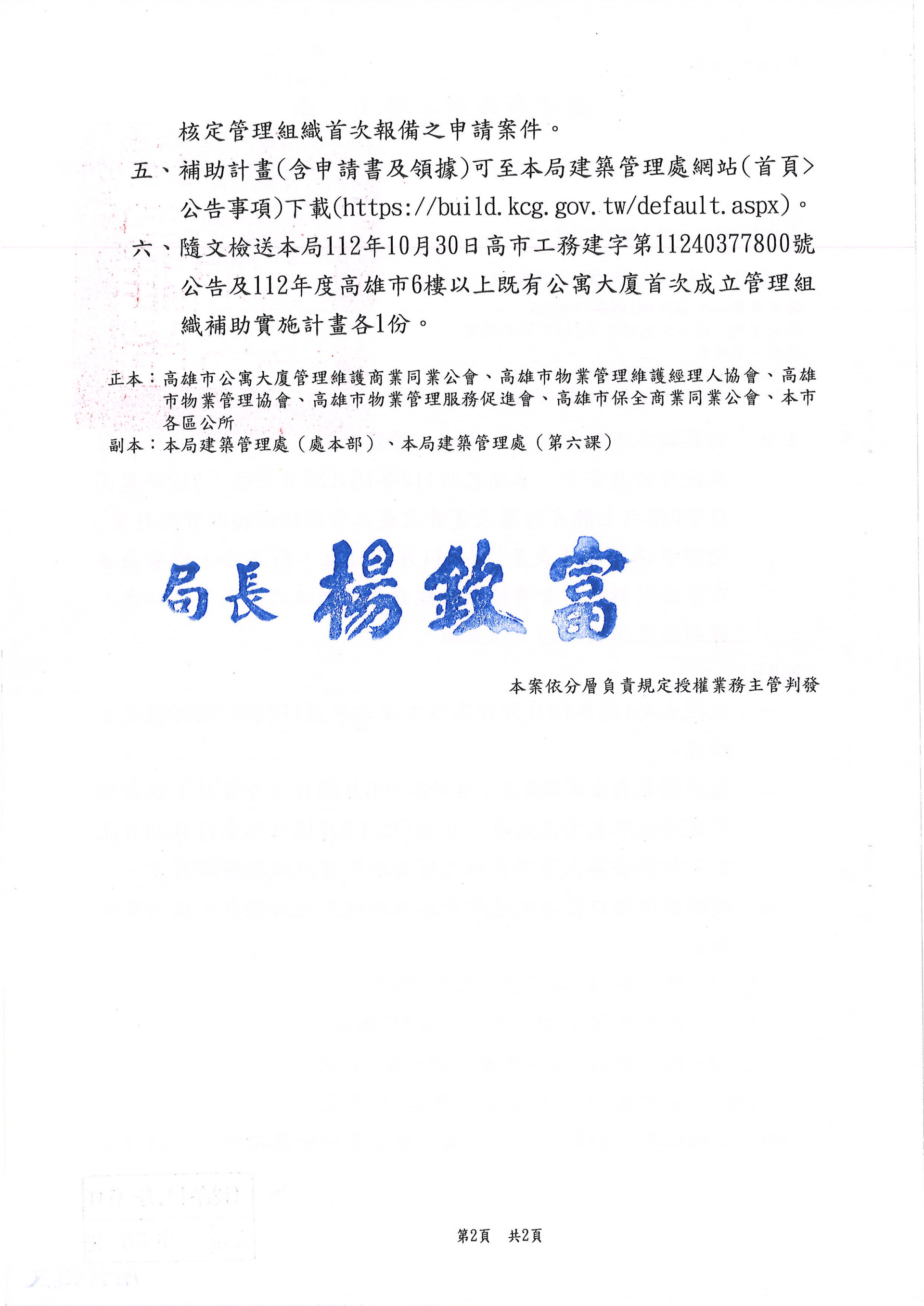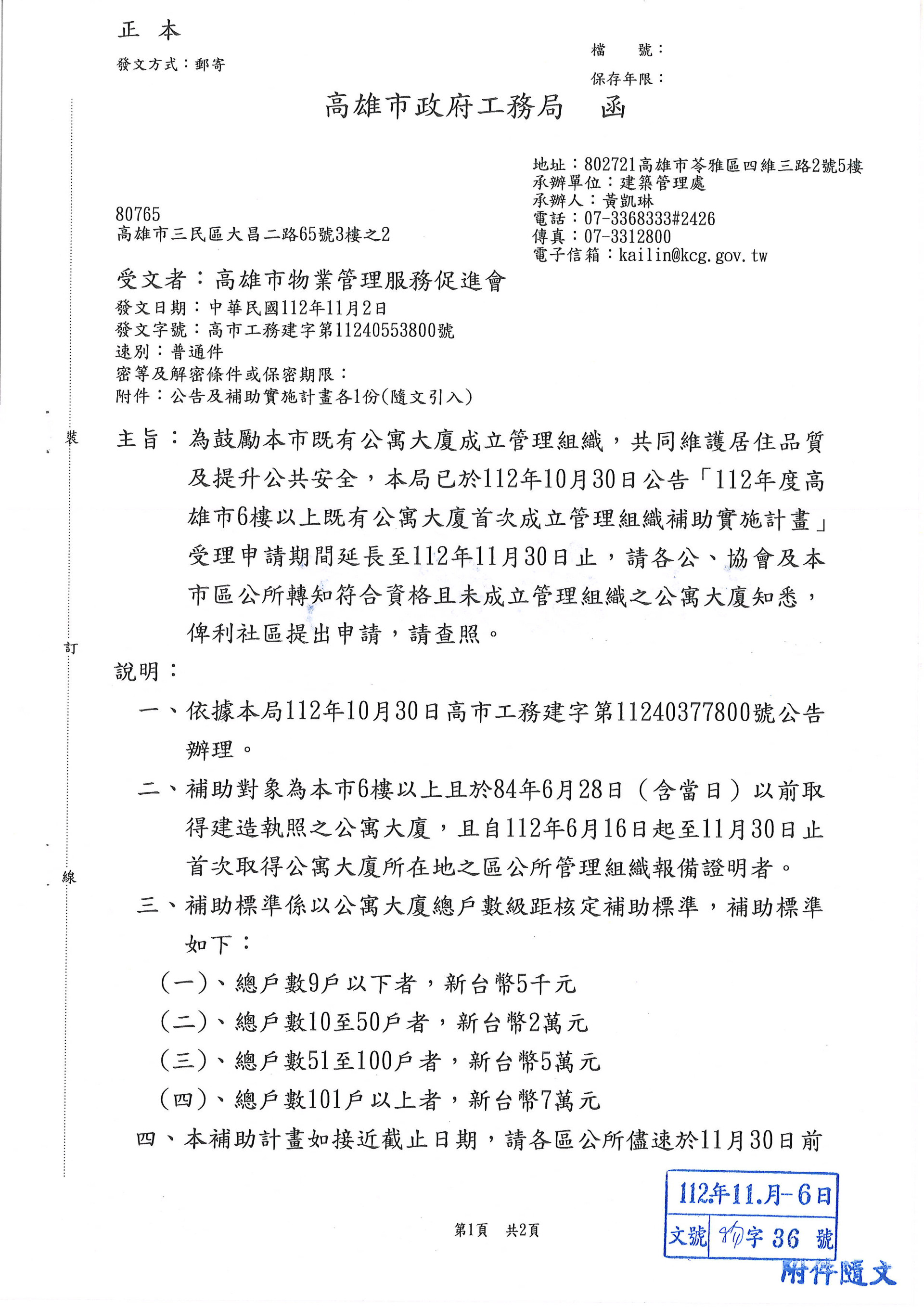 為鼓勵既有公寓大廈成立管理組織,共同維護居住品質提升公共安全,本局已於112/10/30公告「112年度高雄市6樓以上既有公寓大廈首次成立管理組織補助實施計畫」受理申請時間延長至112年11月30日止