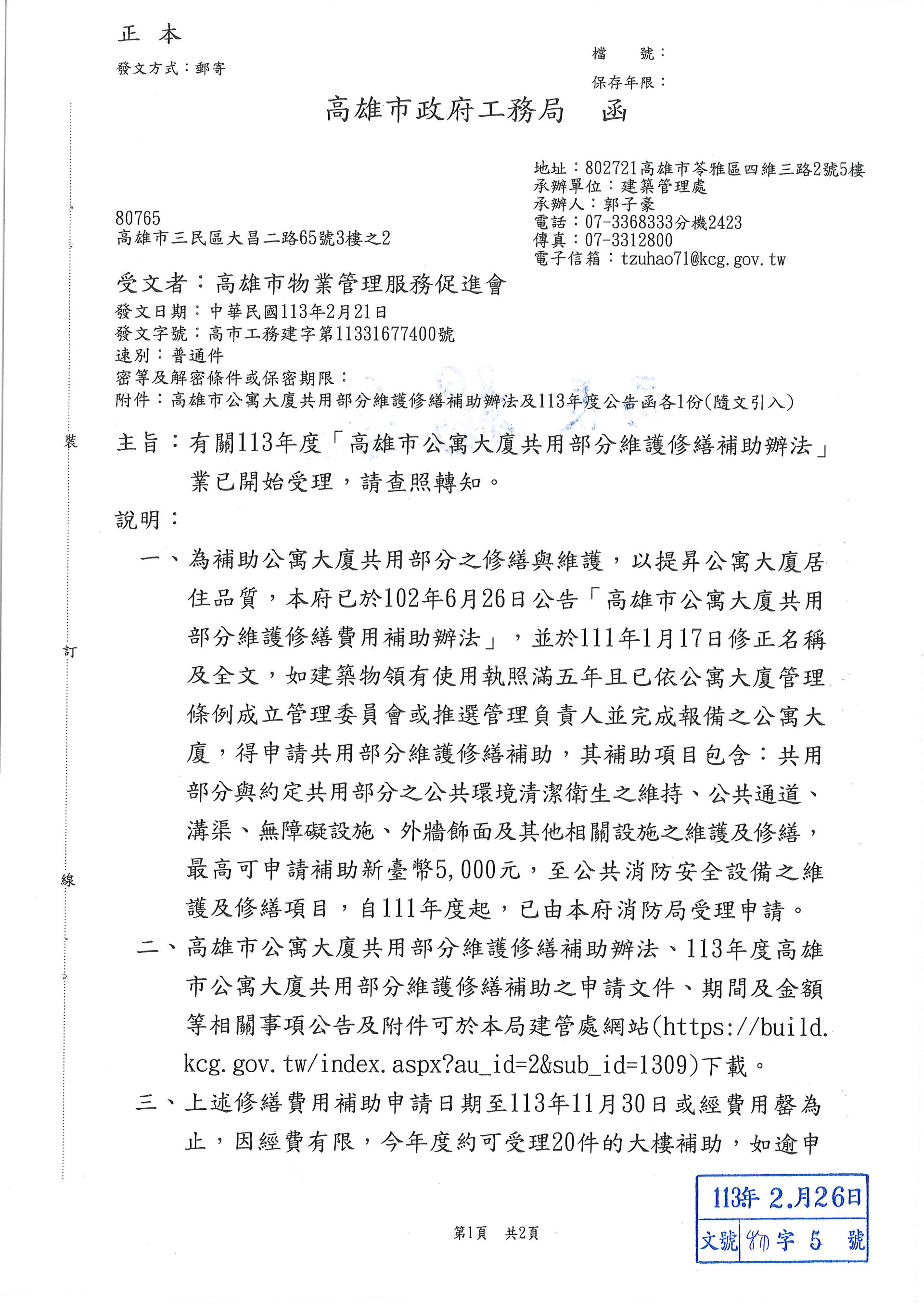 有關113年度[高雄市公寓大廈共用部分維護修繕補助辦法]業已開始受理
