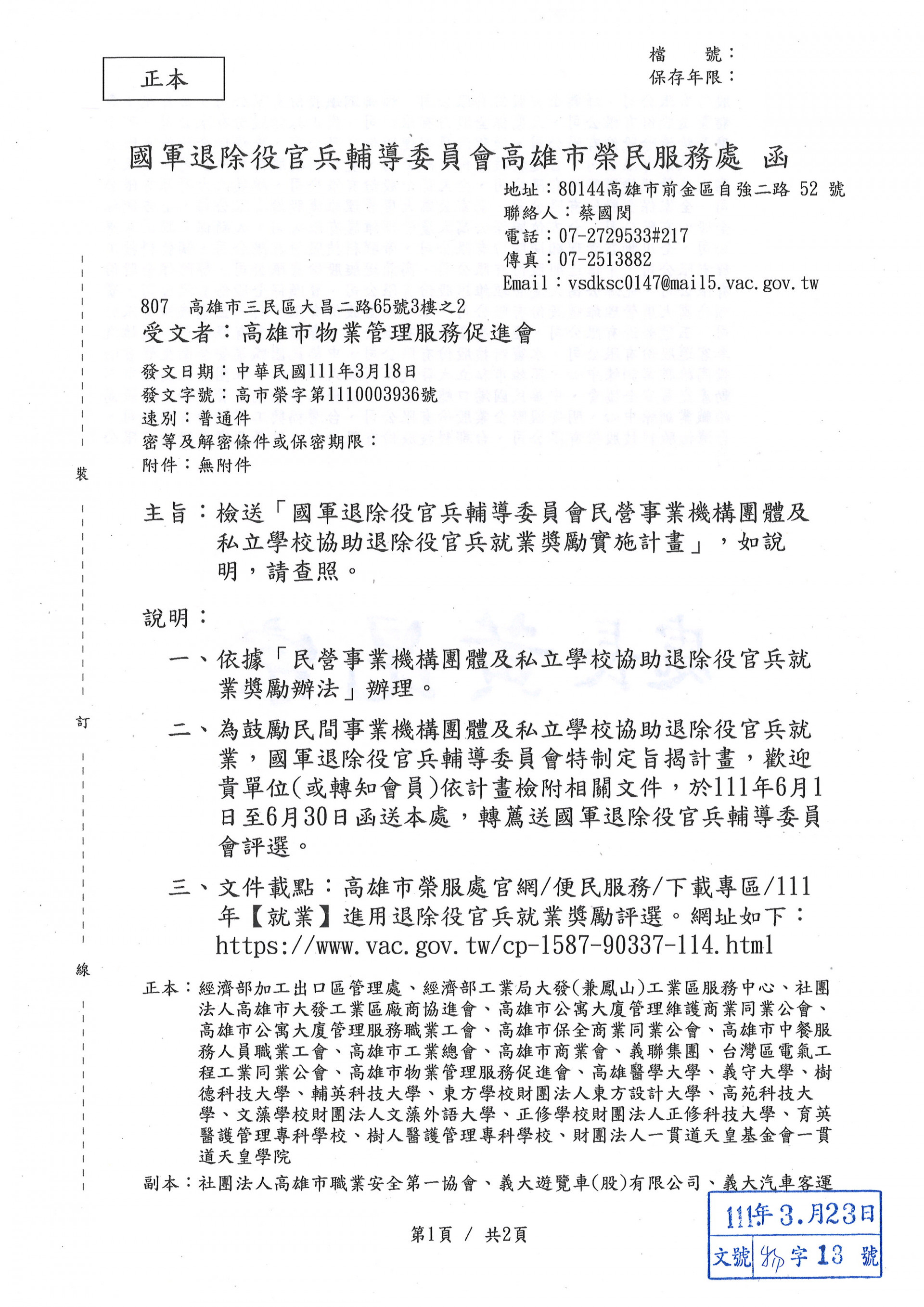 檢送[國軍退除役官兵輔導委員會民營事業機構團體及私立學校協助退除役官兵就業獎勵實施計畫]